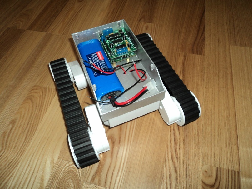 Подключил датчик Sharp GP2D120 в количестве одной штуки. Сверху планируется поворотная башня, голосовой модуль (Mp3) и возможно управление по Wi-Fi.