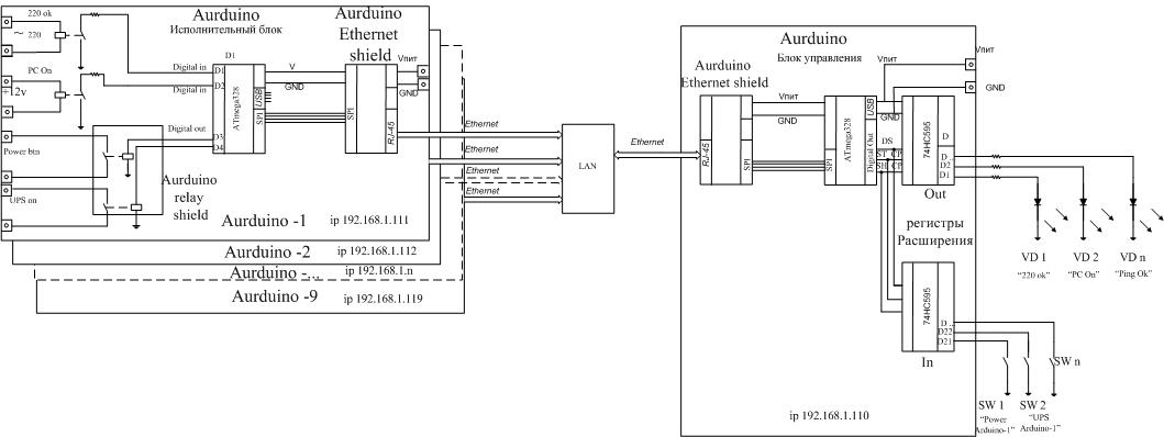 Управляющий блок состоит из МК Aurduino, сетевого интерфейса Arduino Ethernet, регистра расширения входов - выходов и светодиодов VD индикации сетевого питания 220 в, работы компьютера а так же его сетевой доступности.