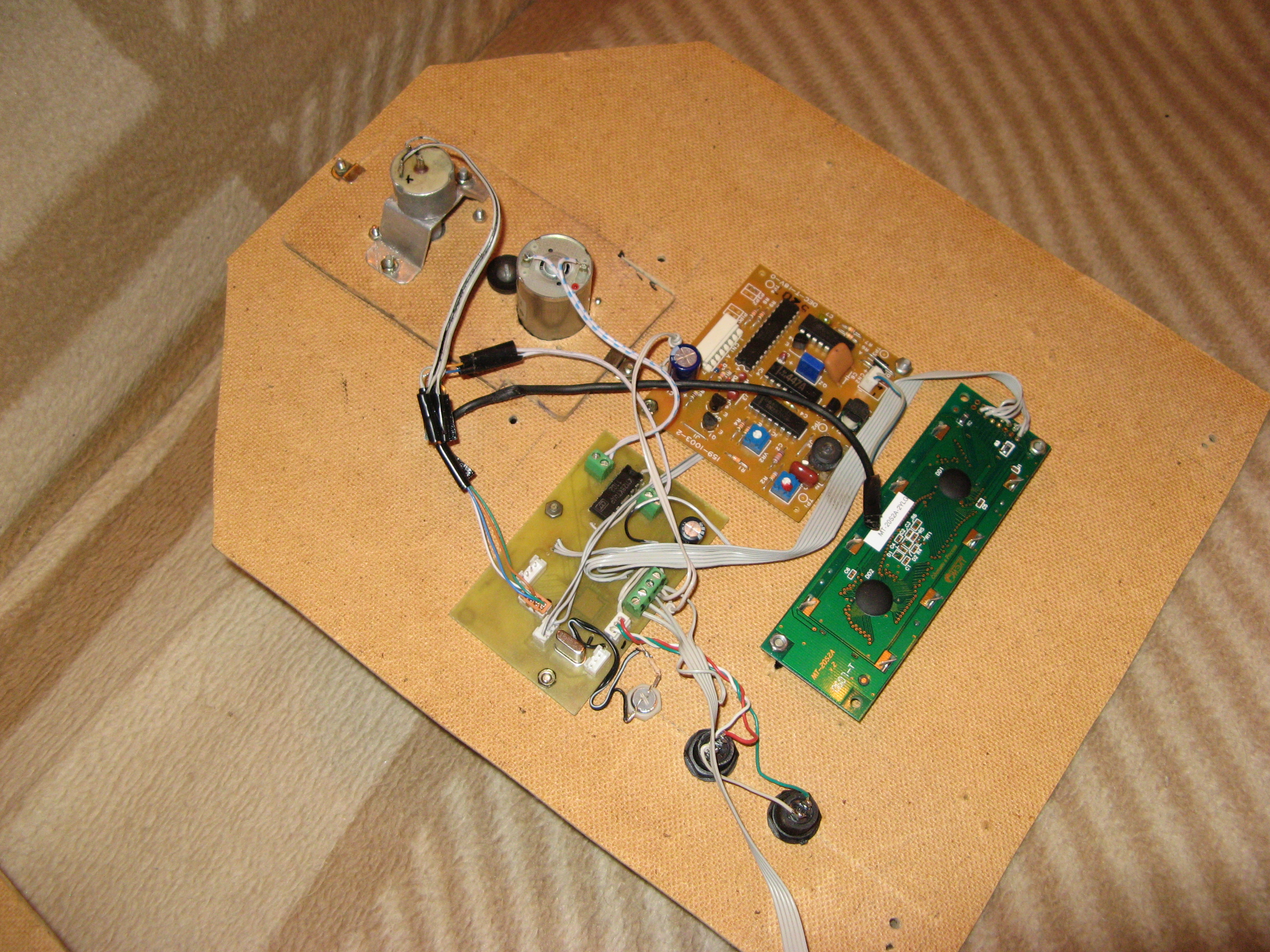 Как видно из фотографий, я не стал использовать готовые сервоприводы - их я сделал "с нуля". Оба привода имеют обратную связь через переменные резисторы и управляются контроллером.
