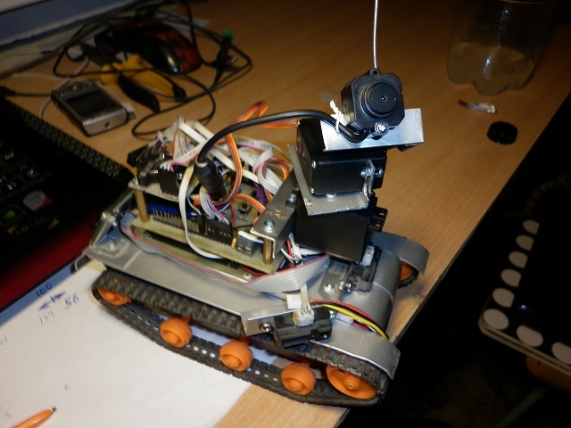 Недавно прицепил камеру на 2-х сервах, питание на камеру подается по команде с пульта. Управляется все с ИК пульта, давно уже хочу Bluetooth-UART модуль прикупить и управлять с ПК написав соответствующий софт но все руки не доходят.