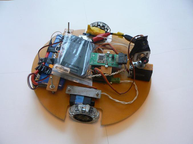 Используются: плата контроллера OR-AVR-M128-DS bluetooth модуль OR-BT20-115.2, Li-Po аккумулятор 5800mAh, сонар MaxBotix LV-MAXSONAR-EZ1, преобразователь напряжения для питания двигателей (модифицированных серв HXT12K), камера вращается сервой HXT5010.