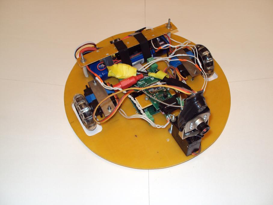 Используются: плата контроллера OR-AVR-M128-DS bluetooth модуль OR-BT20-115.2, Li-Po аккумулятор 5800mAh, сонар MaxBotix LV-MAXSONAR-EZ1, преобразователь напряжения для питания двигателей (модифицированных серв HXT12K), камера вращается сервой HXT5010.