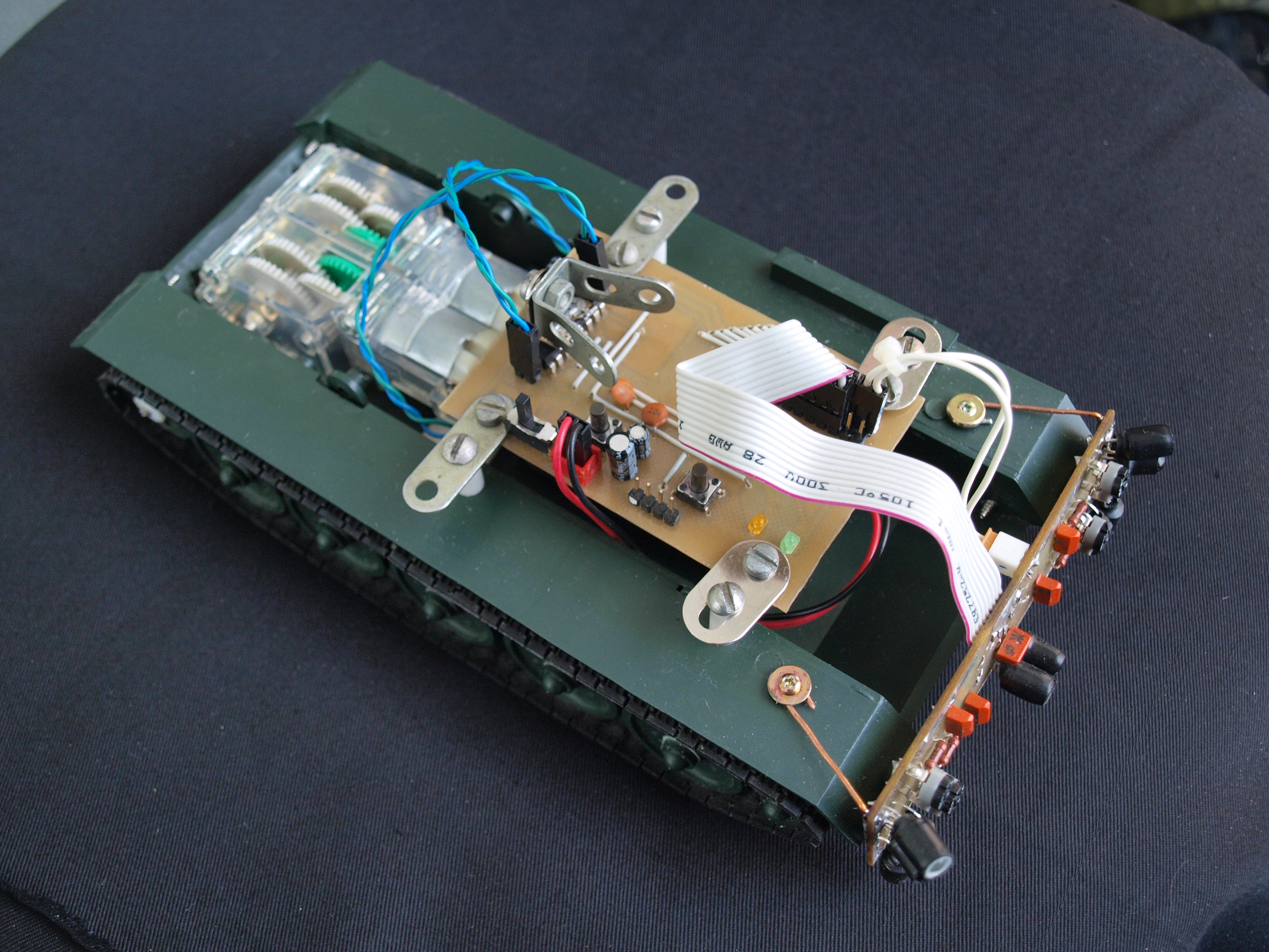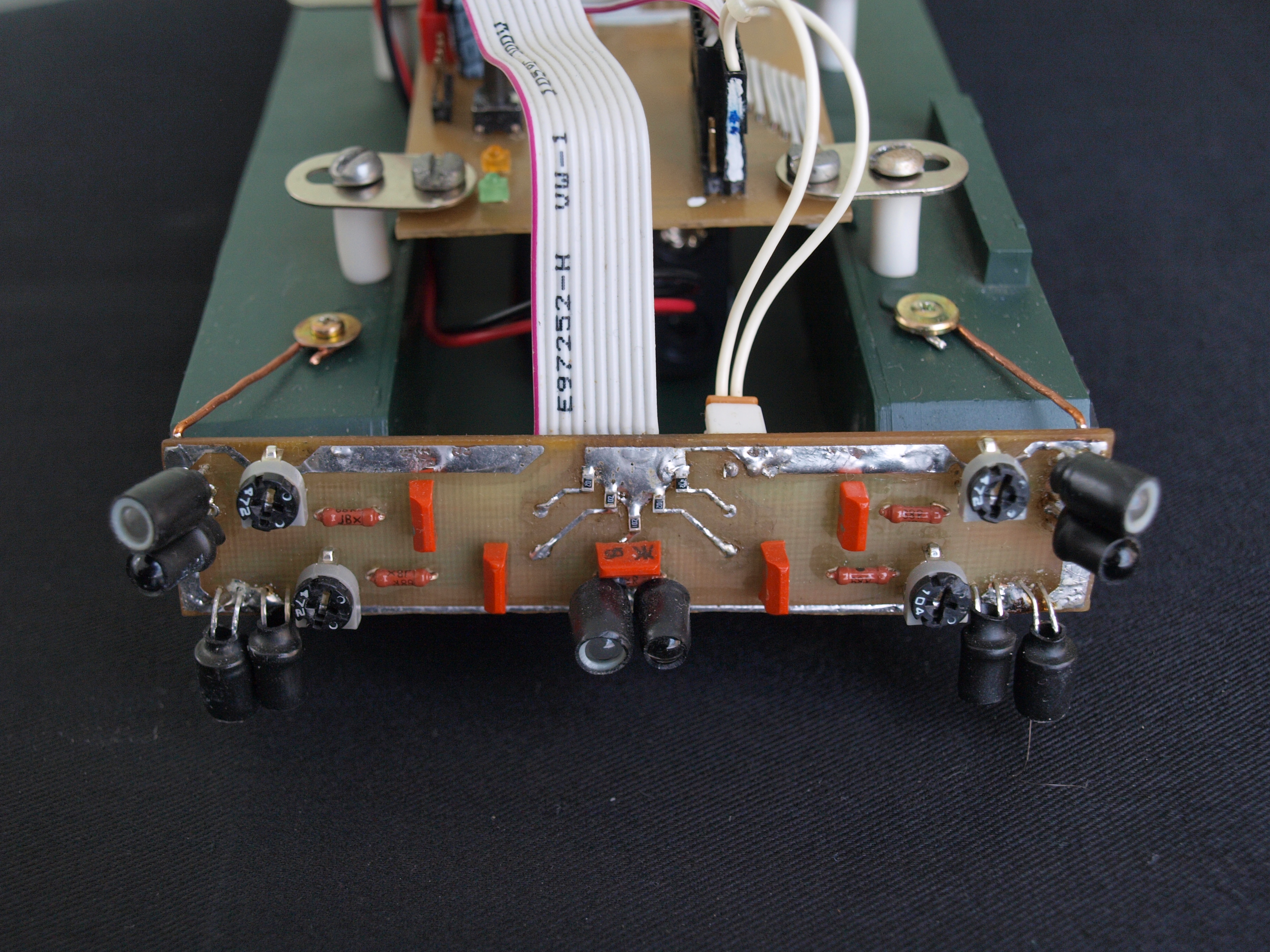 через них подключены ИК-диоды. Это сделано затем, что их ток потребления сильно превышает возможности портов микроконтроллера. Также на бампере установлены переменные резисторы, за счет которых можно регулировать чувствительность фототранзисторов.