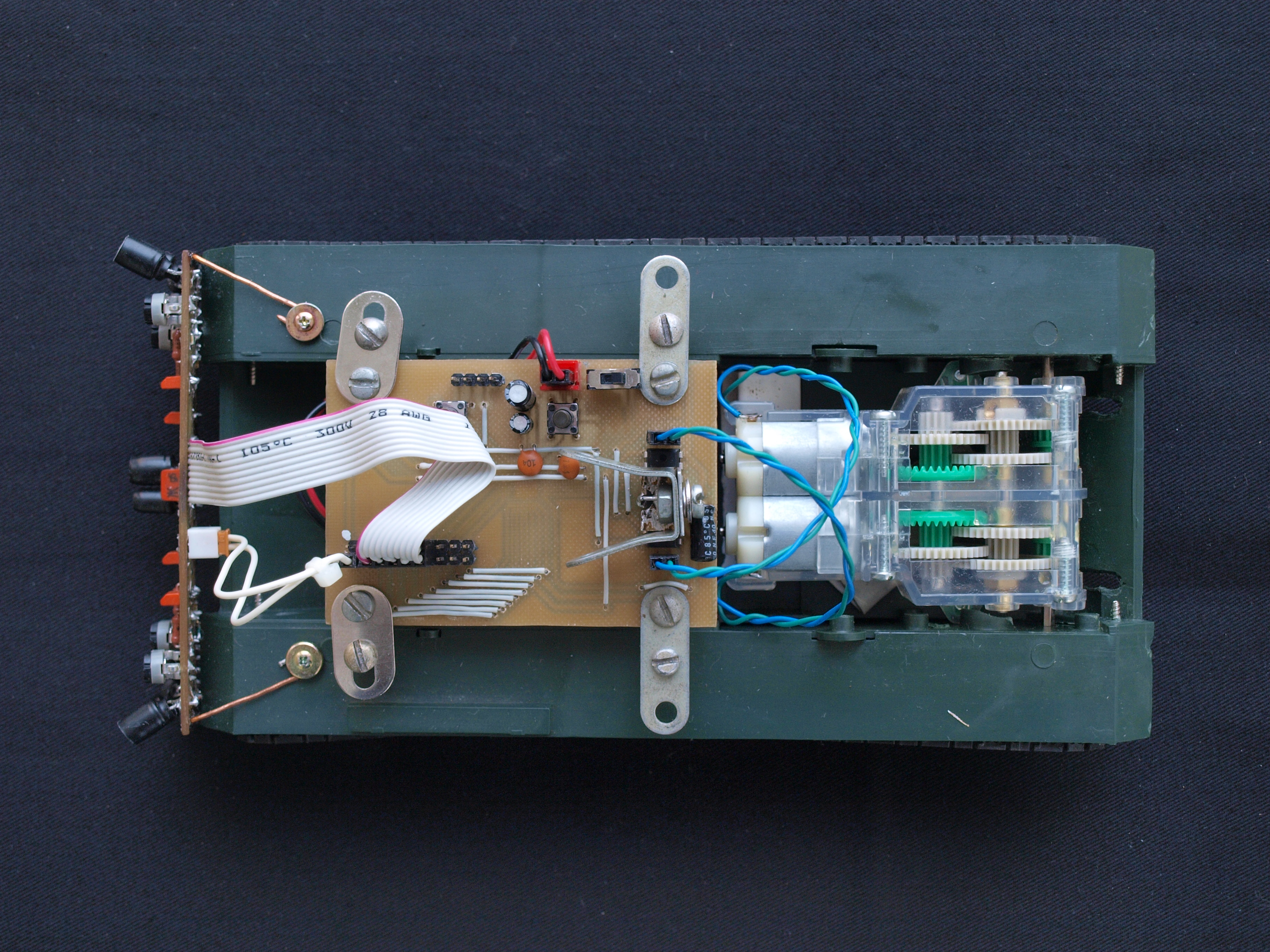 через них подключены ИК-диоды. Это сделано затем, что их ток потребления сильно превышает возможности портов микроконтроллера. Также на бампере установлены переменные резисторы, за счет которых можно регулировать чувствительность фототранзисторов.