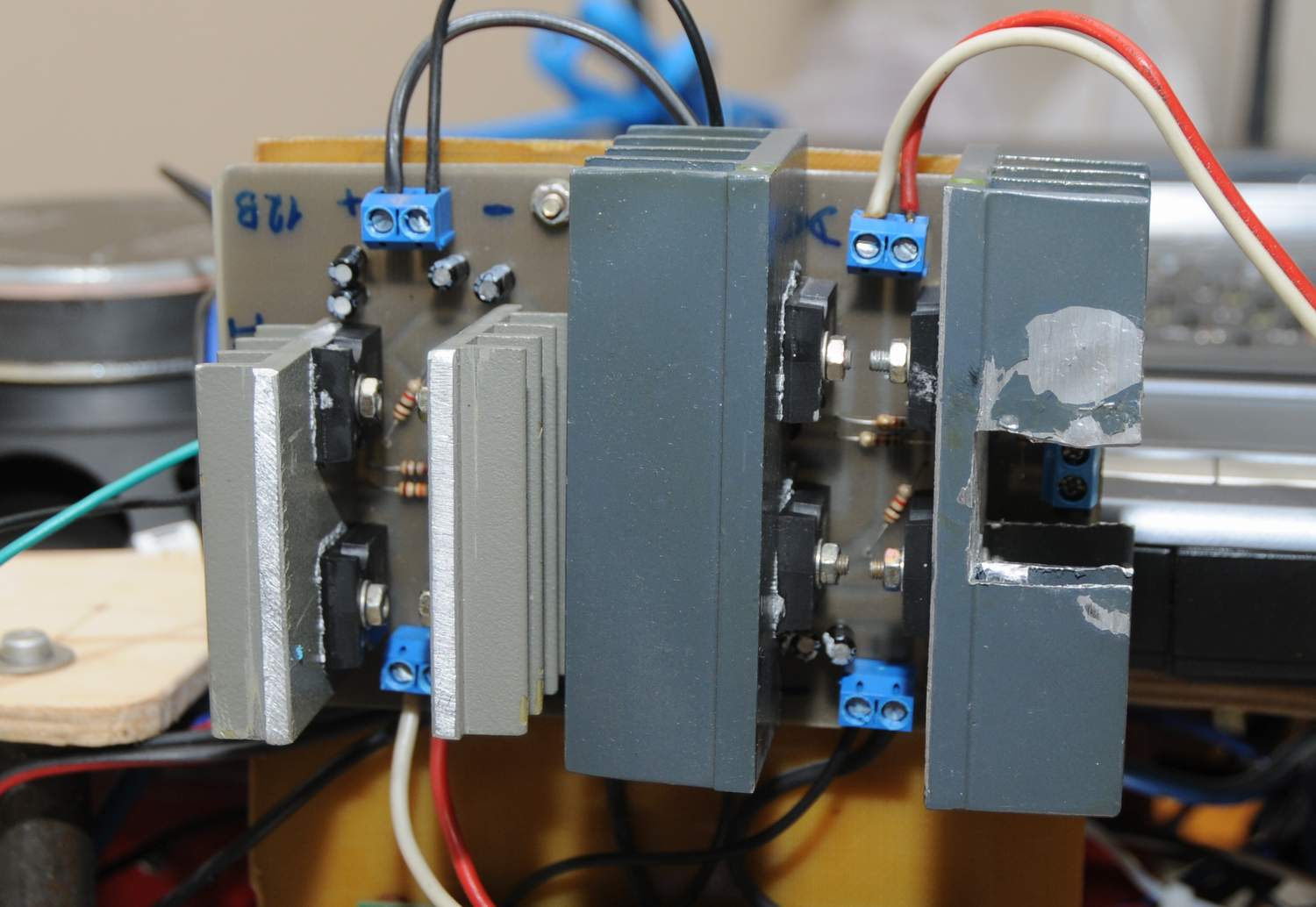 http://www.pyroelectro.com/tutorials/h_bridge_4_transistor/index.htmlРадиаторы повесил с запасом - потому что как выяснилось, что двигатель даже без нагрузки уже греет транзисторы, с радиаторами - транзисторы вообще холодные.