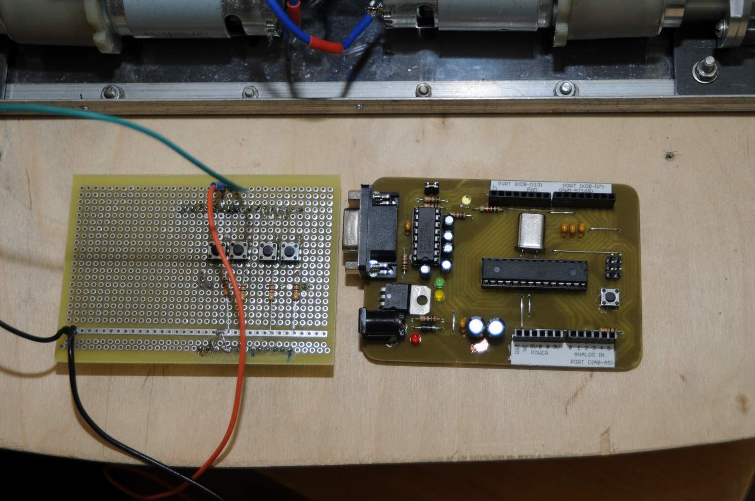 Сделал на макетке простой шилд, на который повесил по паре кнопок и написал простенькую программу, которая управляет скоростью вращения двигателей - одна кнопка увеличивает скорость при нажатии, вторая - уменьшает. Пока так решил попробовать как будет работать.