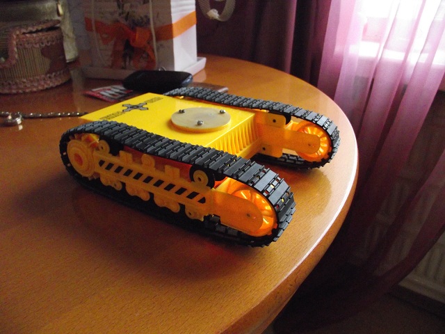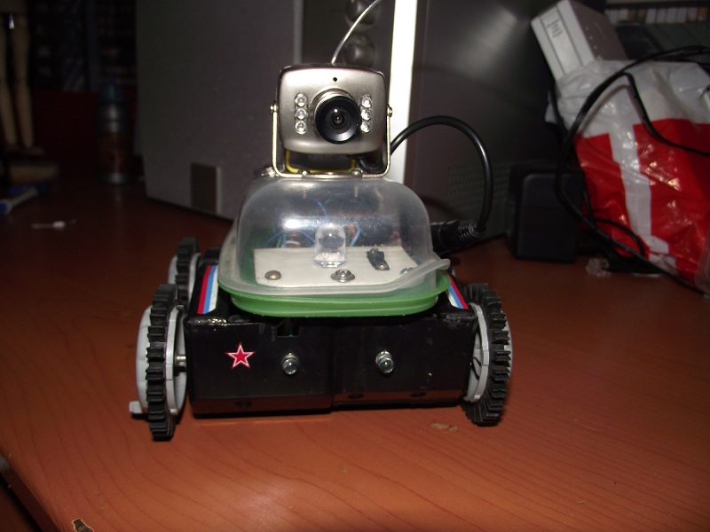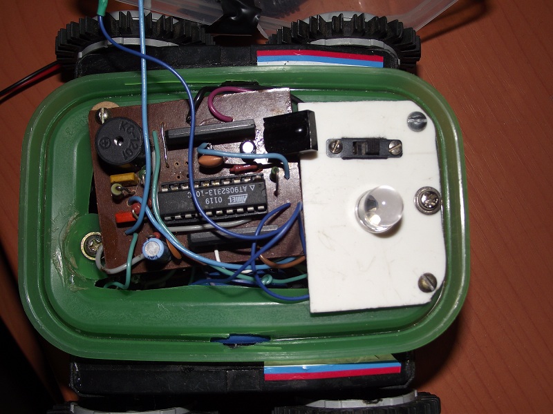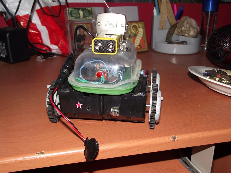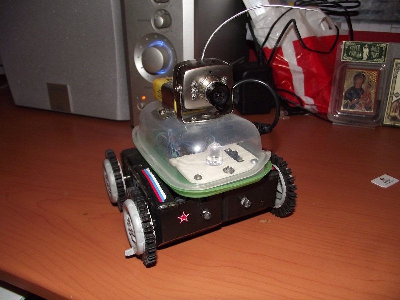Питается всё от 4-ёх пальчиковых аккумов на 2650 mA/h .Схему брал из журнала радио за 2006 год. Она довольно проста и имеет возможность совершенствования. Схема собрана на контроллере atmel AT90S2313 и драйверах двигателей TA7291S.Робот может ездить вперёд назад ,делать танковый разворот в обе стороны,поворачивать 1 парой колёс(например правые колёса крутятся а левые стоят),может светить фарами и пищать.Камера обыкновенная с радиоканалом с питанием от кроны . Все потроха закрыл пластиком для защиты. В дальнейшем планирую установку ик бампера .И в конце хотел спросить у меня есть ходовая от игрушечного эксковатора с гусеницами(обожаю гусеницы)хотел собрать на её базе радиоуправление и навесить разные датчики.Но появилась проблема её клиренс менее 5 мм