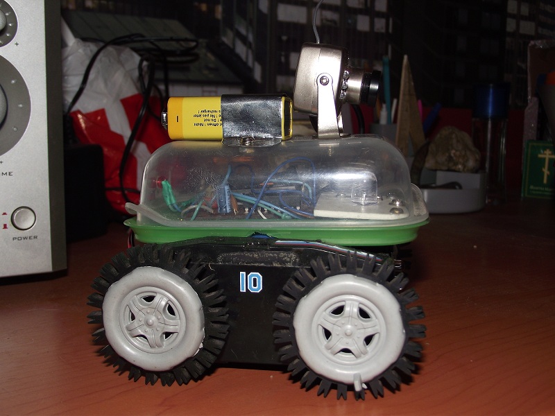 Питается всё от 4-ёх пальчиковых аккумов на 2650 mA/h .Схему брал из журнала радио за 2006 год. Она довольно проста и имеет возможность совершенствования. Схема собрана на контроллере atmel AT90S2313 и драйверах двигателей TA7291S.Робот может ездить вперёд назад ,делать танковый разворот в обе стороны,поворачивать 1 парой колёс(например правые колёса крутятся а левые стоят),может светить фарами и пищать.Камера обыкновенная с радиоканалом с питанием от кроны . Все потроха закрыл пластиком для защиты. В дальнейшем планирую установку ик бампера .И в конце хотел спросить у меня есть ходовая от игрушечного эксковатора с гусеницами(обожаю гусеницы)хотел собрать на её базе радиоуправление и навесить разные датчики.Но появилась проблема её клиренс менее 5 мм