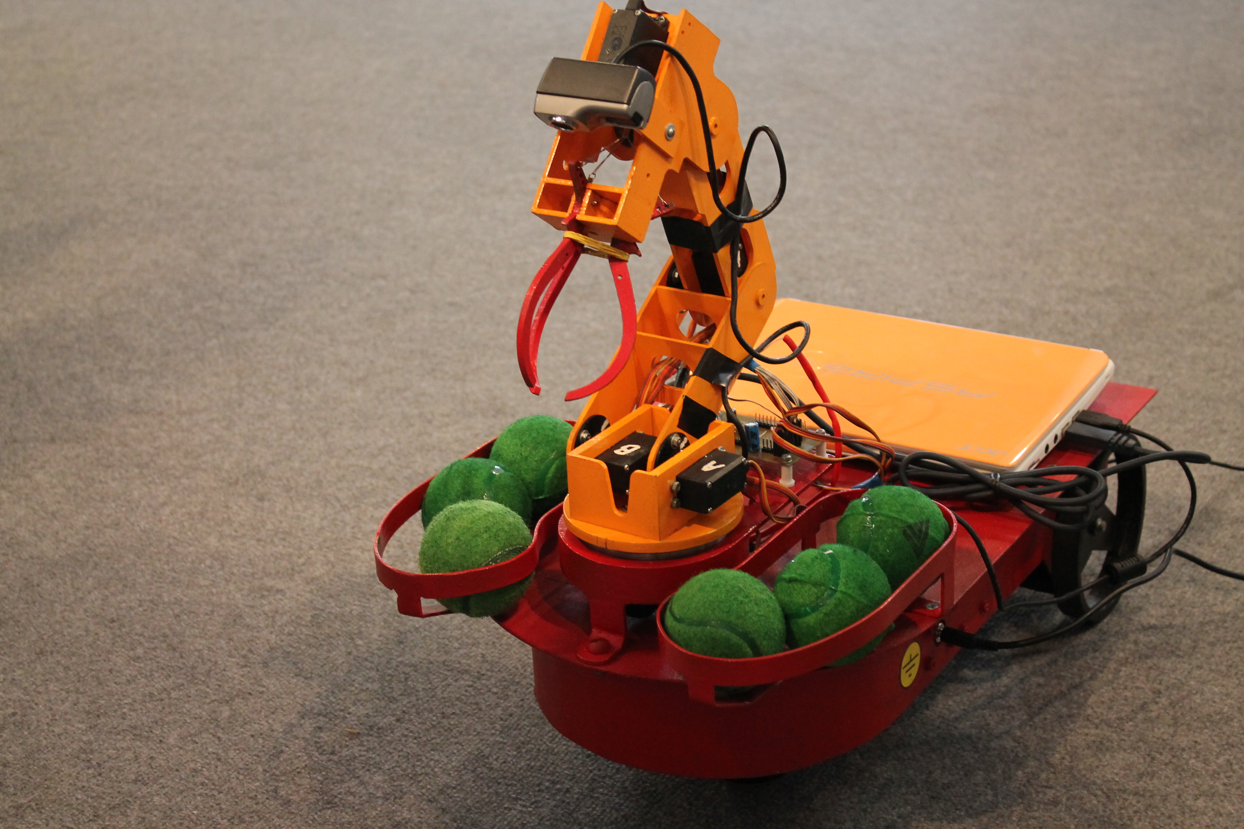 Собственно ШкРоб а точнее школьный работ предназначенный для обучения школьников и студентов программированию. На платформе установлено две платы с микроконтроллерами PIC24, одна плата для управления манипулятором, вторая для управления двигателями. Платы соединены между собой по RS-232 и подключены к нетбуку через UART-to-USB. Для демонстрации аппаратных и программных возможностей была написана простейшая программа для распознавания и сбора зеленых теннисных шариков.