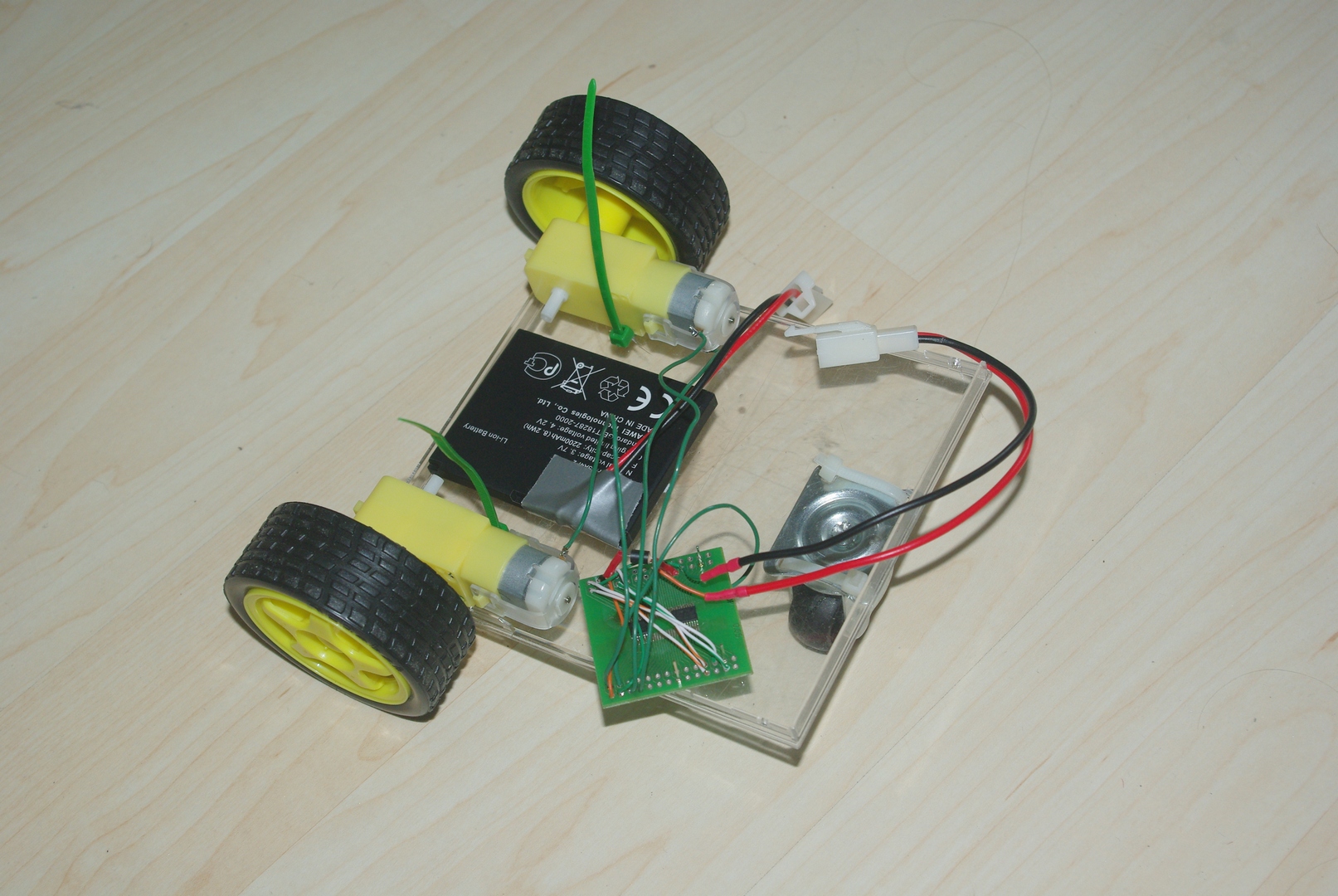 Пока на макетной плате, но уже ездит. Работы по дальнейшему уменьшению размеров ведутся.
