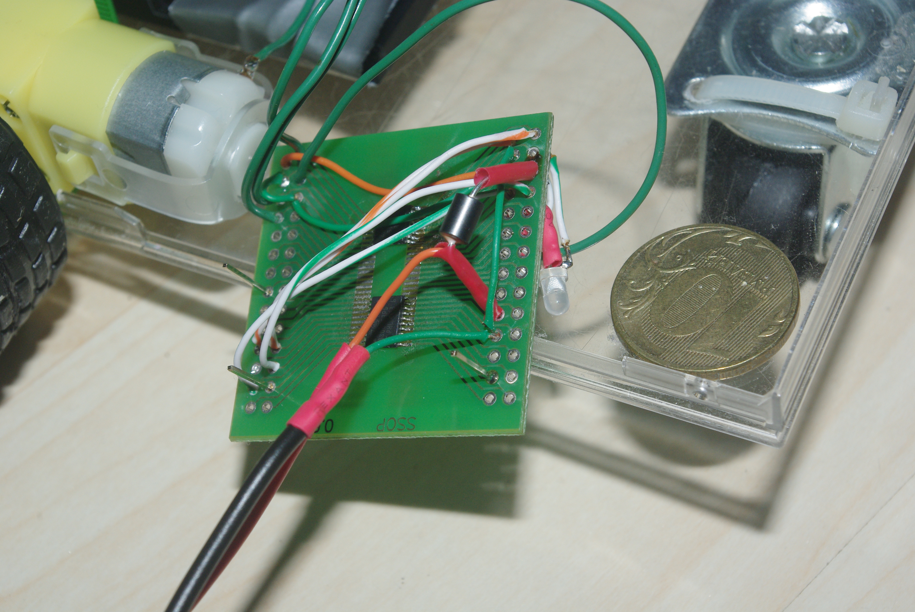Пока на макетной плате, но уже ездит. Работы по дальнейшему уменьшению размеров ведутся.