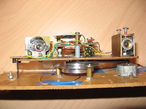 излучатель и приёмник под диском, они не подвижные. диск снизу вашей вращающейся платформы, закрепить его имхо совсем не проблема.