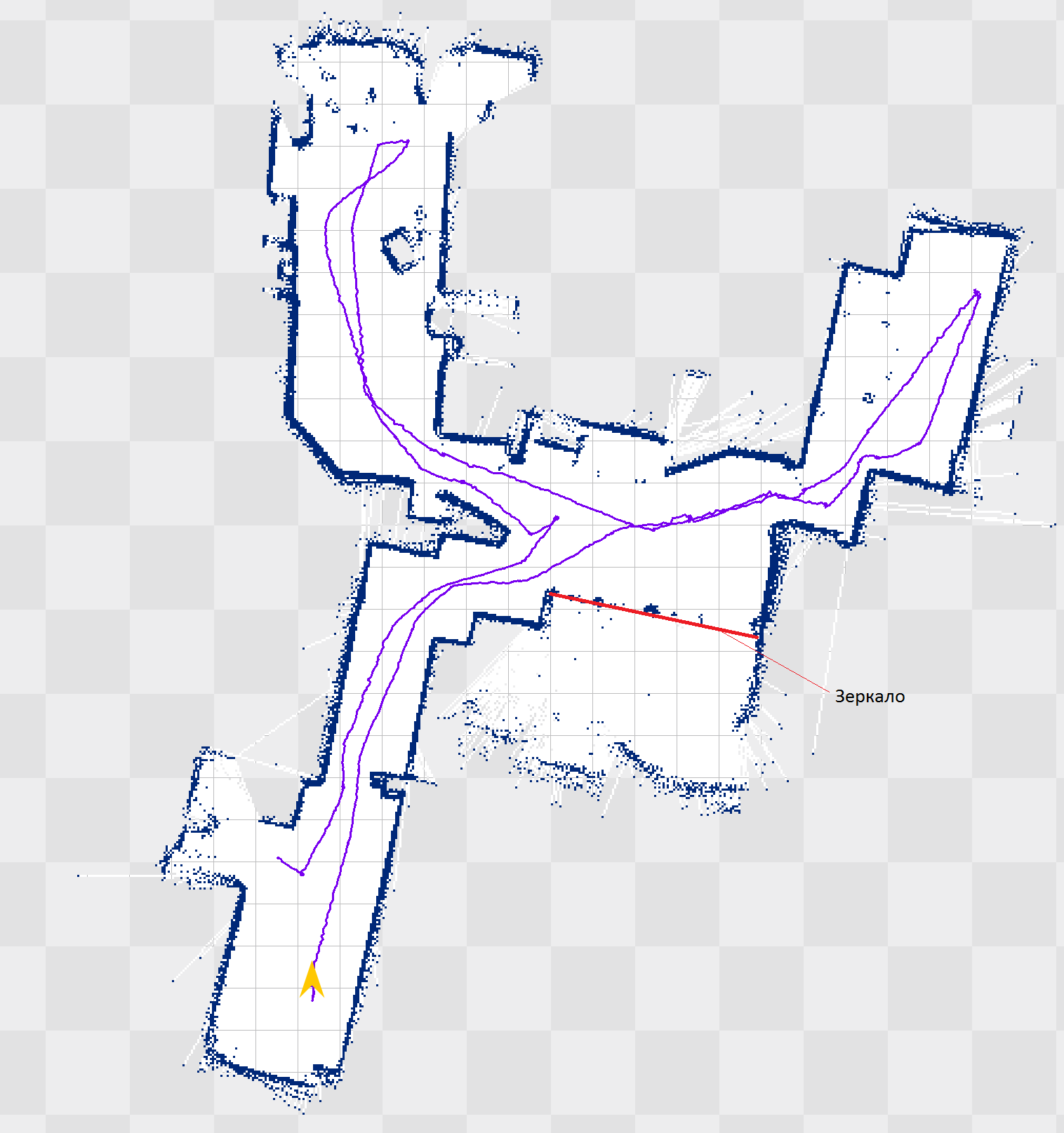 Я не стал закрывать зеркало в коридоре, как видно, это не нарушило работу SLAM. Шума на стенах значительно меньше, чем раньше: post281679.html#p281679 и здесь: post279782.html#p279782 хотя карту опять немного перекосило. Была мысль производить выравнивание векторов.