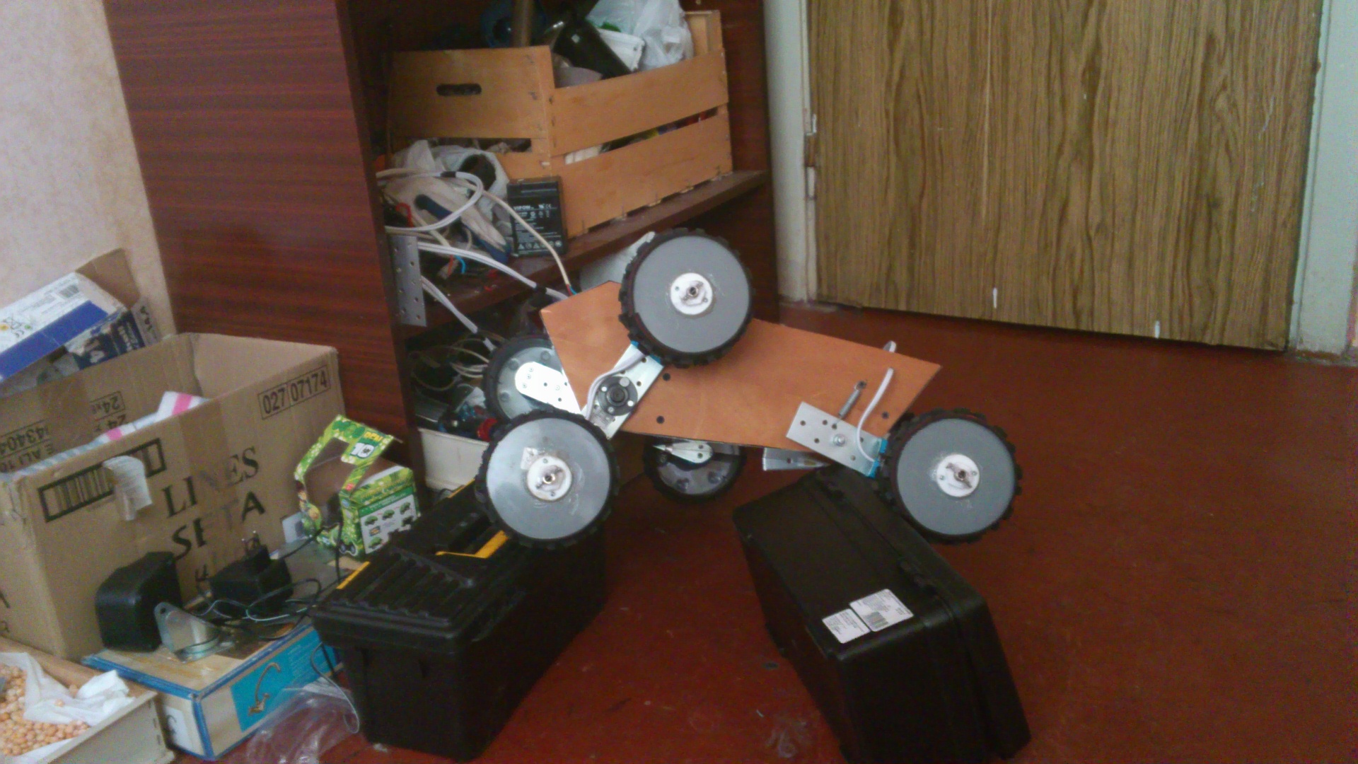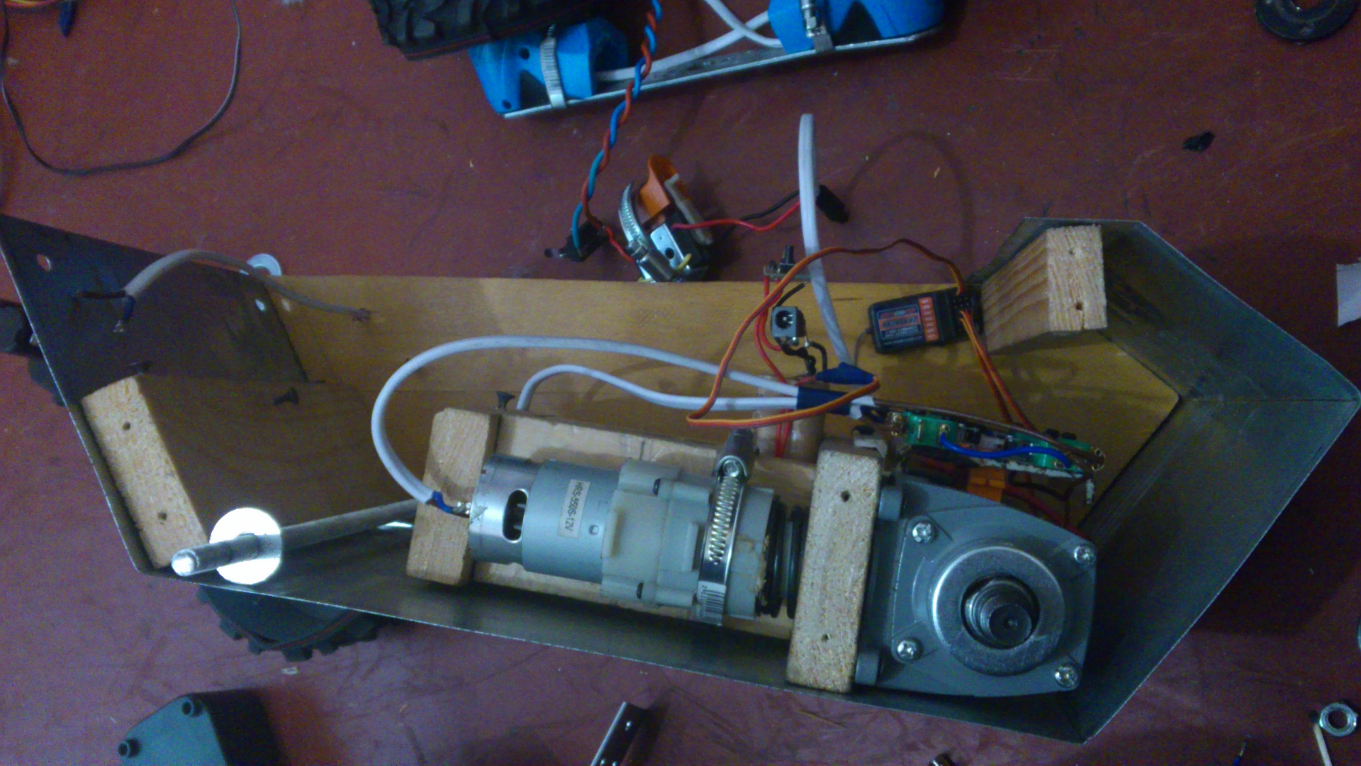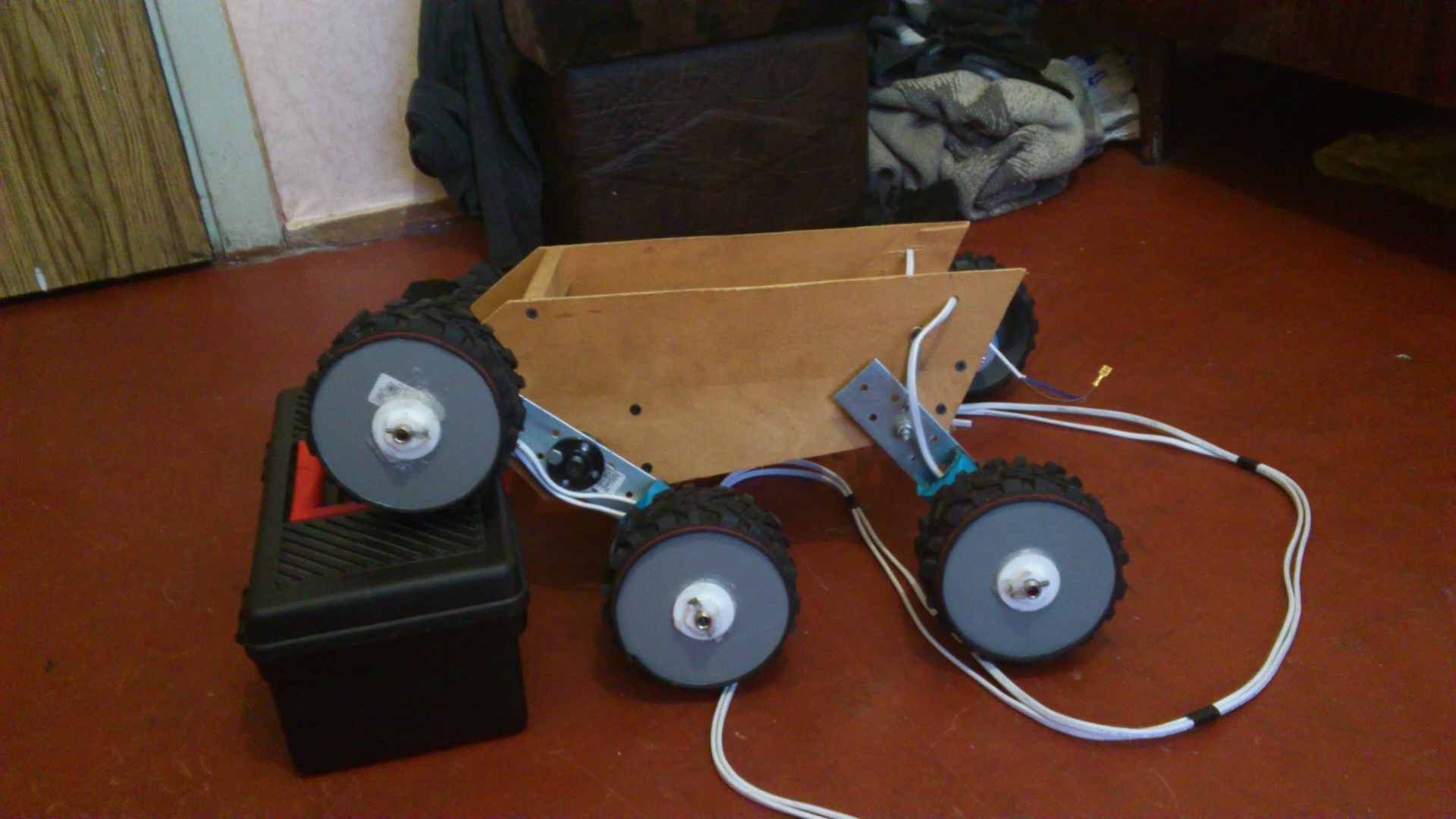что бы не было лишних вопросов отвечаю: шесть моторколес по бортам. передние пары на маятниках, которые могут вращатся от 2х моторов, передача напруги через скользящие контакты. задние 2 колеса просто подпружинены. есть небольшой свободных ход маятников, для огибания ландшафта при движении.