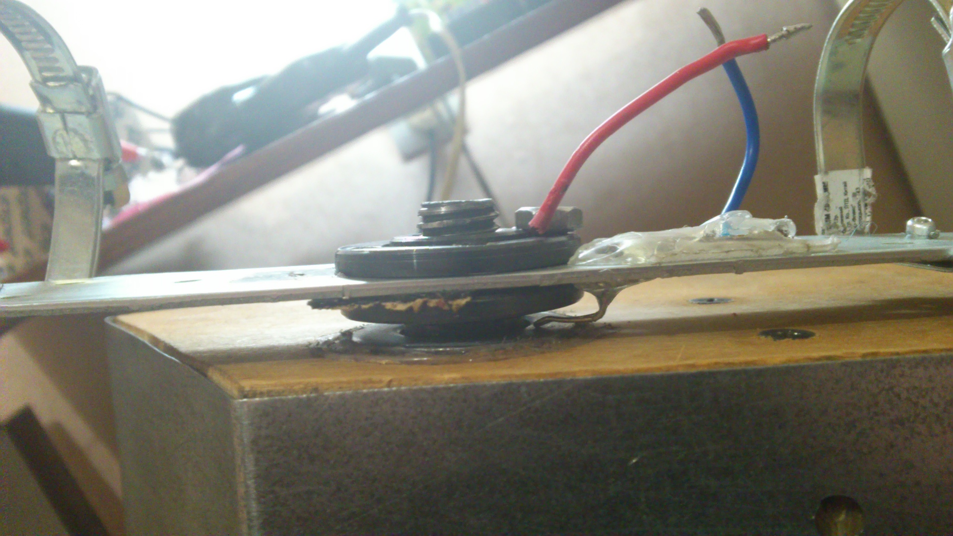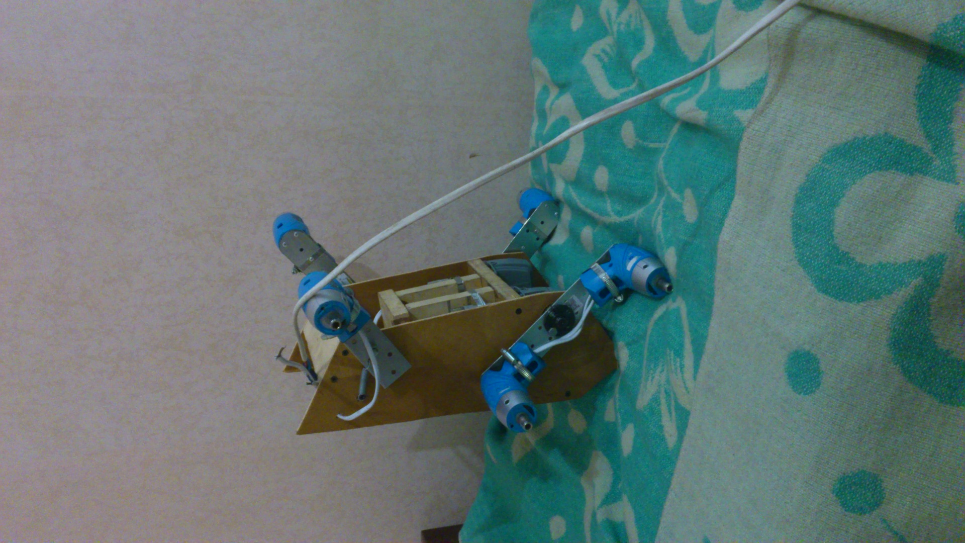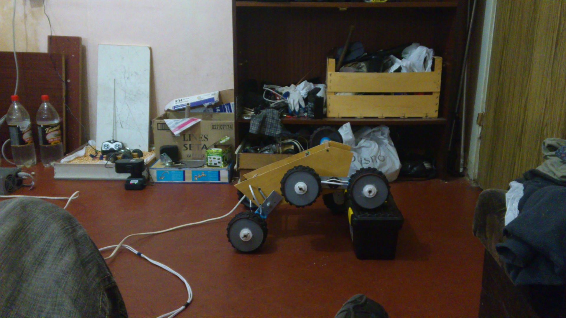 что бы не было лишних вопросов отвечаю: шесть моторколес по бортам. передние пары на маятниках, которые могут вращатся от 2х моторов, передача напруги через скользящие контакты. задние 2 колеса просто подпружинены. есть небольшой свободных ход маятников, для огибания ландшафта при движении.