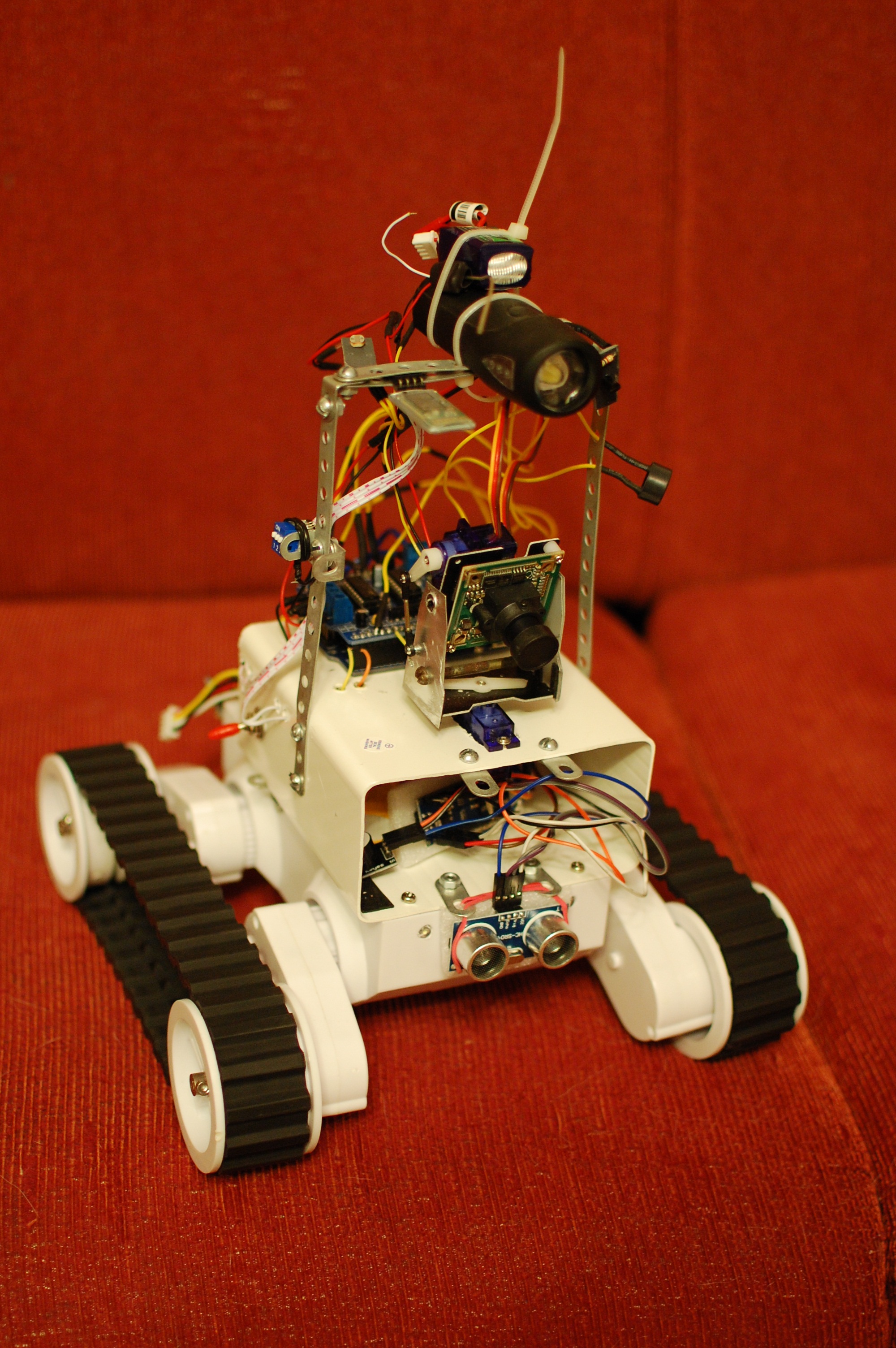 Всем привет! Вот решил собрать робота на дистанционном управлении. По началу сам сделал колесные шасси, но оказалось сделать их ровными непросто. Заказал гусеничную платформу саму простую за 26$,Arduino Uno, motor shield. Управляется робот по БТ со смартфона. На роботе установлен ультразвуковой датчик, работает как парктроник со звуковым сигналом, установлена камера на поворачивающемся креплении с двумя сервами, видео сигнал приходит на ноутбук. Датчик света включает габаритные огни в темноте, головной свет включается с пульта, установлен датчик температуры и вольтметр которые выводят информацию на телефон. В будущем хочу сделать управление с компа, но нет времени пока на освоение Delphi, хочется ещё манипулятор простой, может кто подскажет как лучше его сделать самому или заказать из китая за 30$.