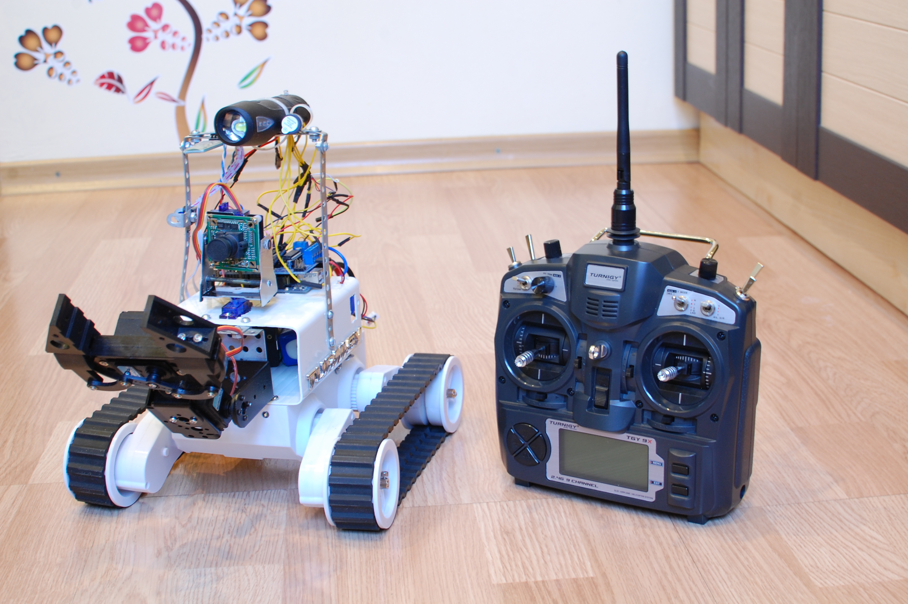 Всем привет! Вот решил собрать робота на дистанционном управлении. По началу сам сделал колесные шасси, но оказалось сделать их ровными непросто. Заказал гусеничную платформу саму простую за 26$,Arduino Uno, motor shield. Управляется робот по БТ со смартфона. На роботе установлен ультразвуковой датчик, работает как парктроник со звуковым сигналом, установлена камера на поворачивающемся креплении с двумя сервами, видео сигнал приходит на ноутбук. Датчик света включает габаритные огни в темноте, головной свет включается с пульта, установлен датчик температуры и вольтметр которые выводят информацию на телефон. В будущем хочу сделать управление с компа, но нет времени пока на освоение Delphi, хочется ещё манипулятор простой, может кто подскажет как лучше его сделать самому или заказать из китая за 30$.