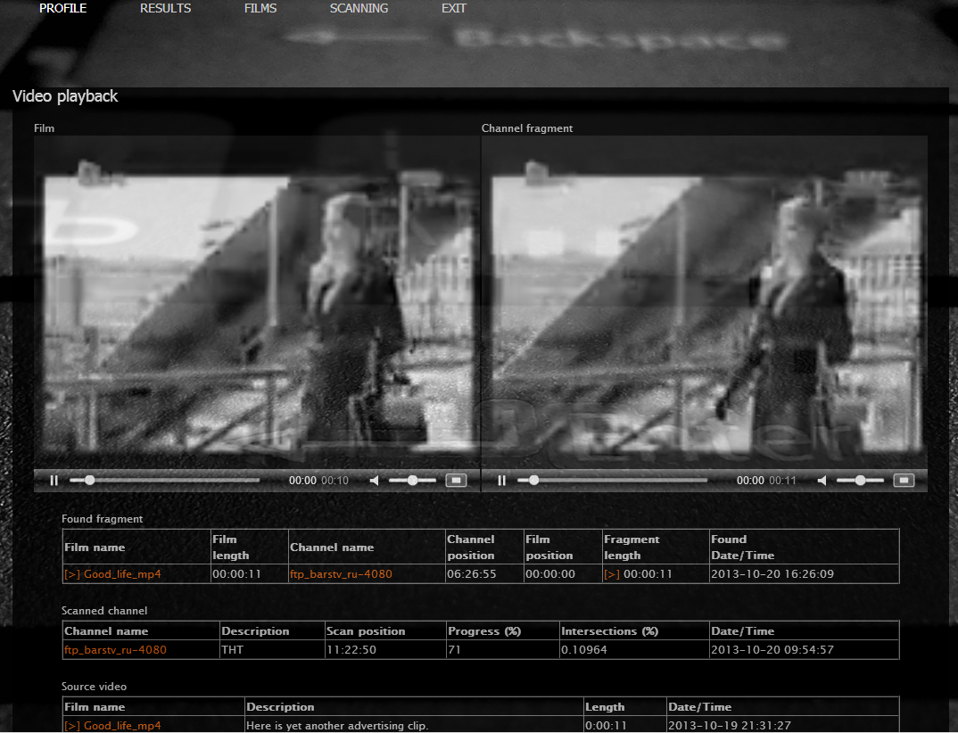 После того, как мы вошли в поисковый сервис мы оказываемся на странице «PROFILE», откуда легко можем просмотреть результаты поиска на каналах, зарегистрированных в системе (таблица «Other channels»), для этого достаточно пройти по ссылкам указанным в таблице. Также вы можете зарегистрировать для сканирования, интересующие вас каналы (вкладка «SCANNING») и загрузить видео (вкладка «FILMS»), которое необходимо искать на всех зарегистрированных в системе каналах.