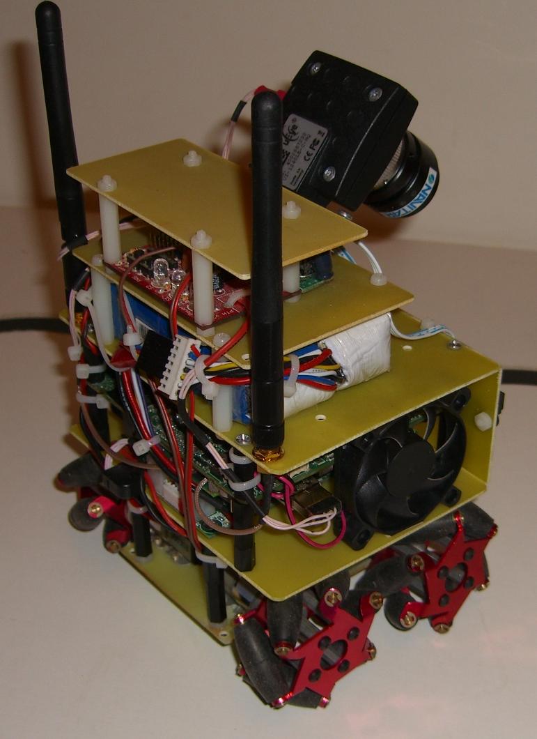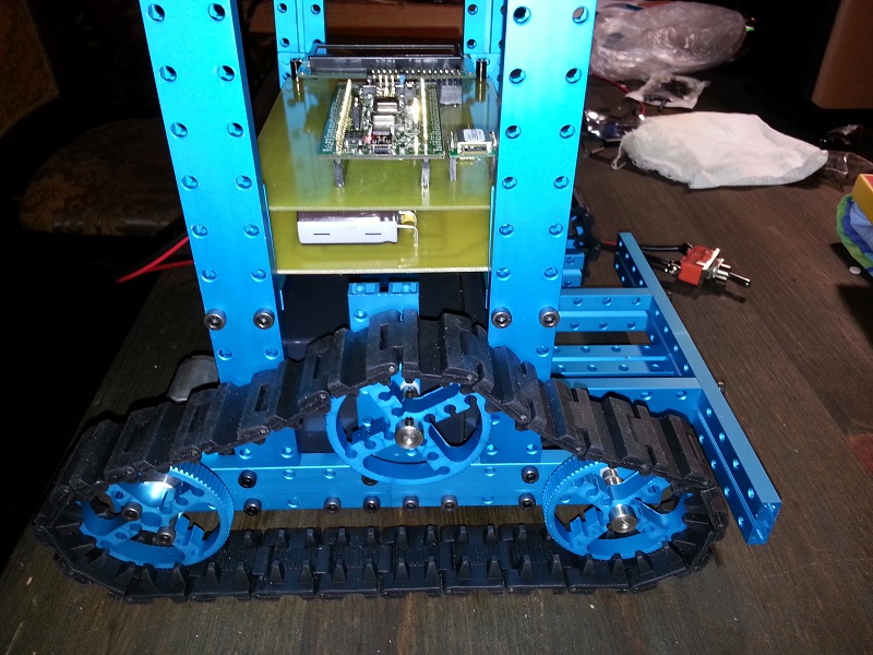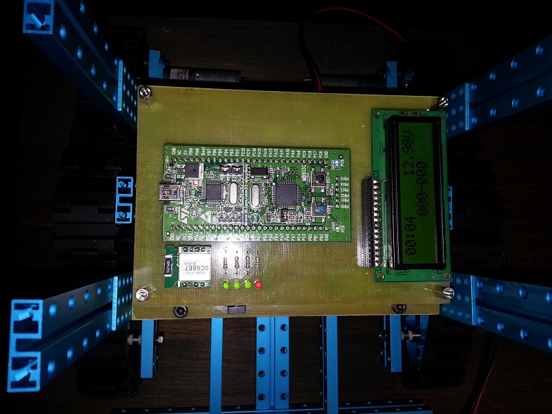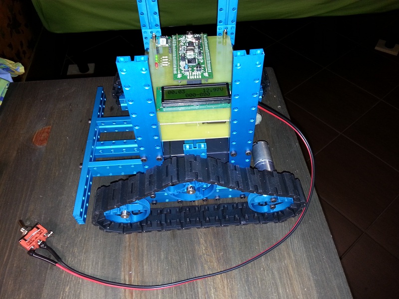 Мозг stm32vldiscovery. Умеет измерять напряжение аккумулятора и общаться по BT. 3 свободынх уарта, 4 PWM (буду менять гусеницы на 4 колеса с энкодерами) и еще десяток свободных ног различного назначения для расширения. Управление с компа через терминал, командами или клавишами. С андроид-телефона управление экранными кнопками, пальцем или так же, терминальными командами (архив с прогой и проектом для Android SDK в на текущей стадии выложен в соседней теме http://roboforum.ru/forum10/topic11963-195.html). В качестве камеры - тот же телефон с андроидом и DroidCam на борту. Аккумулятор обычный, 7-и амперник из UPS, зарядка, тот же UPS уже без аккумулятора.