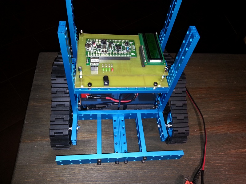 Мозг stm32vldiscovery. Умеет измерять напряжение аккумулятора и общаться по BT. 3 свободынх уарта, 4 PWM (буду менять гусеницы на 4 колеса с энкодерами) и еще десяток свободных ног различного назначения для расширения. Управление с компа через терминал, командами или клавишами. С андроид-телефона управление экранными кнопками, пальцем или так же, терминальными командами (архив с прогой и проектом для Android SDK в на текущей стадии выложен в соседней теме http://roboforum.ru/forum10/topic11963-195.html). В качестве камеры - тот же телефон с андроидом и DroidCam на борту. Аккумулятор обычный, 7-и амперник из UPS, зарядка, тот же UPS уже без аккумулятора.