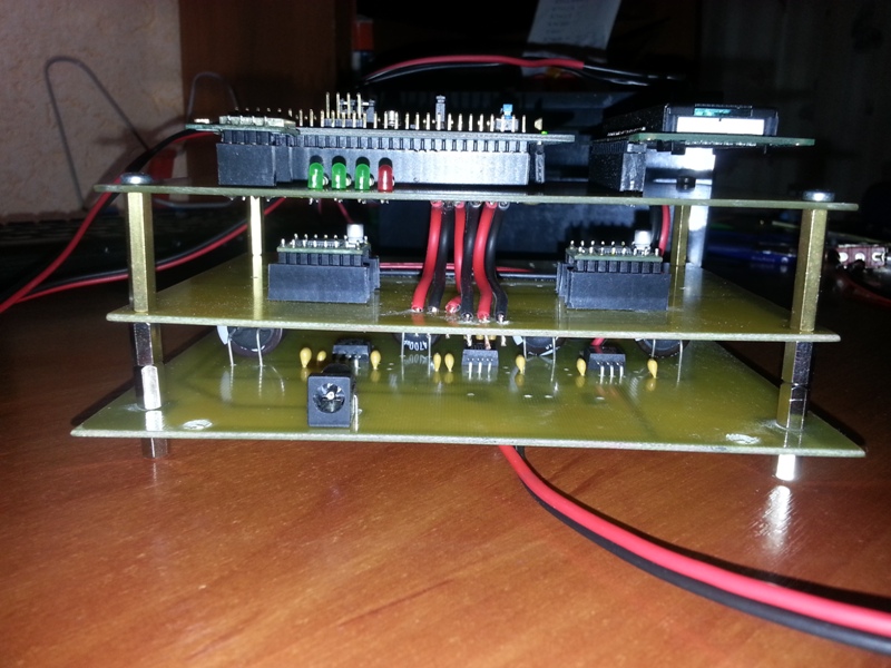 Прикрутил драйвера. Использовал парочку TB6612FNG Dual Motor Driver Carrier http://www.pololu.com/product/713/. Получилось не совсем оптимально, пришлось добавлять целый этаж у бутерброду. Зато, запас по мощности, если текущие движки окажутся слабоватыми, можно будет поменять на 37D. Теперь, буду все собирать и проводить тест драйв и нагрузочный тест.