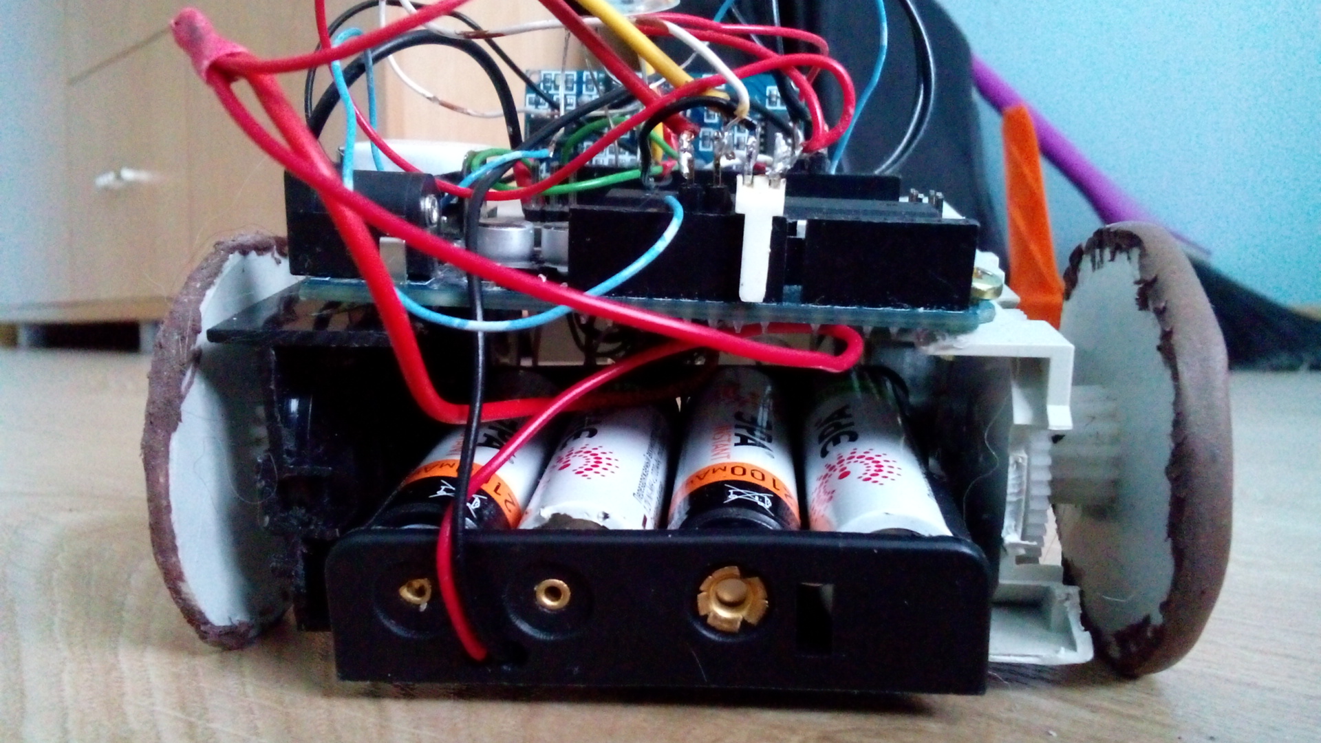 Просто очень рад что наконец-то что-то получилось)Наконец-то я собрался с силами и собрал своего робота. Шасси робота сделал из выпиленных из CD приводов редукторов(которые лоток выдвигают) За мозги пока Arduino Uno(не дорос я еще до голых avr-ок...). В качестве драйвера двигателей выступает микросхема LB1649 от фирмы Sanyo. Также на роботе установлен всем известный УЗ сонар HC-SR04.