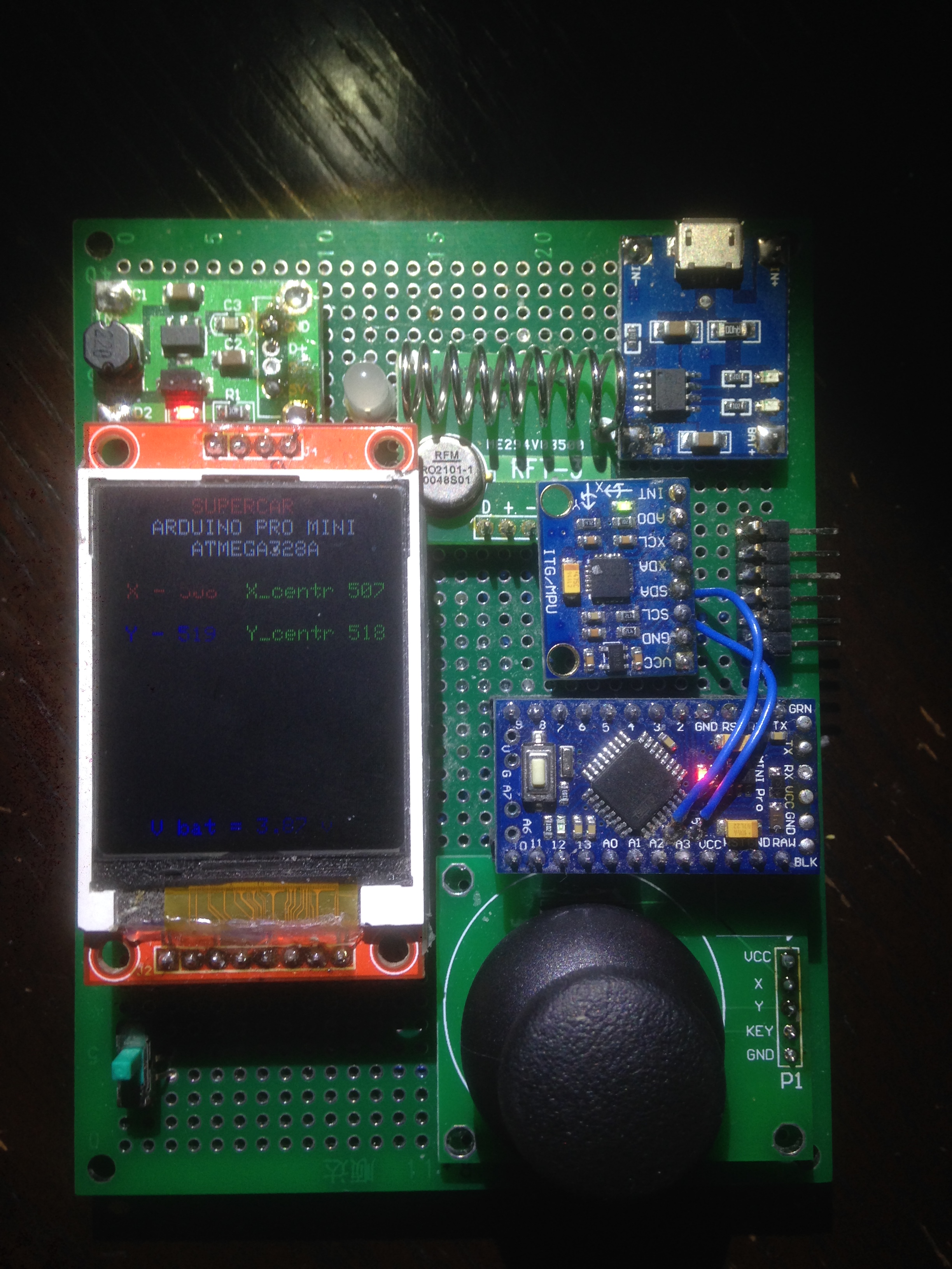 Пульт тоже с дисплеем цветным, резистивный джойстик, гироскоп - пока не подключен, DC-DC преобразователь, схема заряда литиевого аккумулятора.