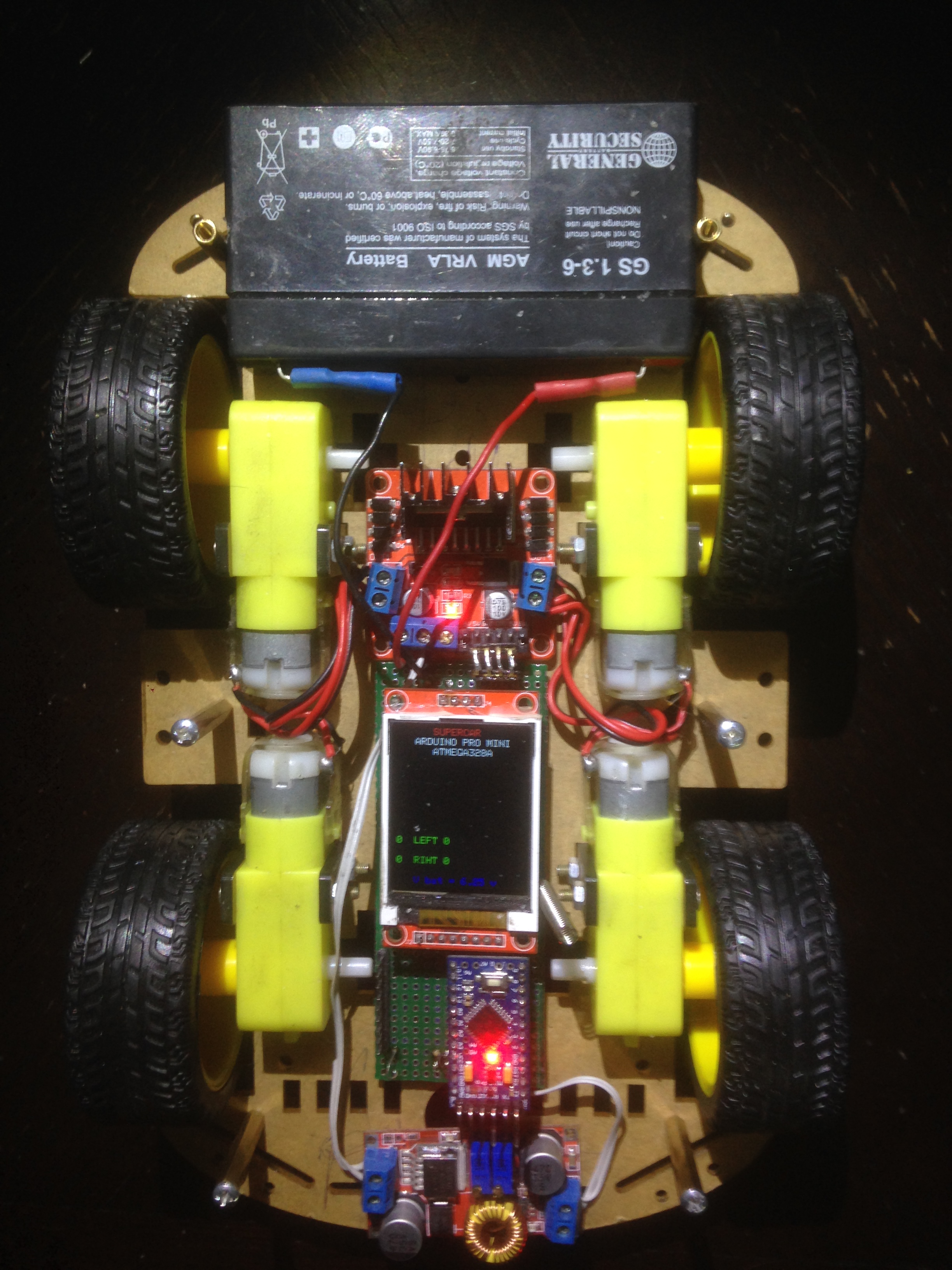 Драйвер двигателей на L298N. Два канала, на каждом канале по два двигателя, левая и правая сторона. Ардуинка на 328 меге, и цветной дисплей 1.8 дюйма на контролере ST7735 для вывода служебной информации.