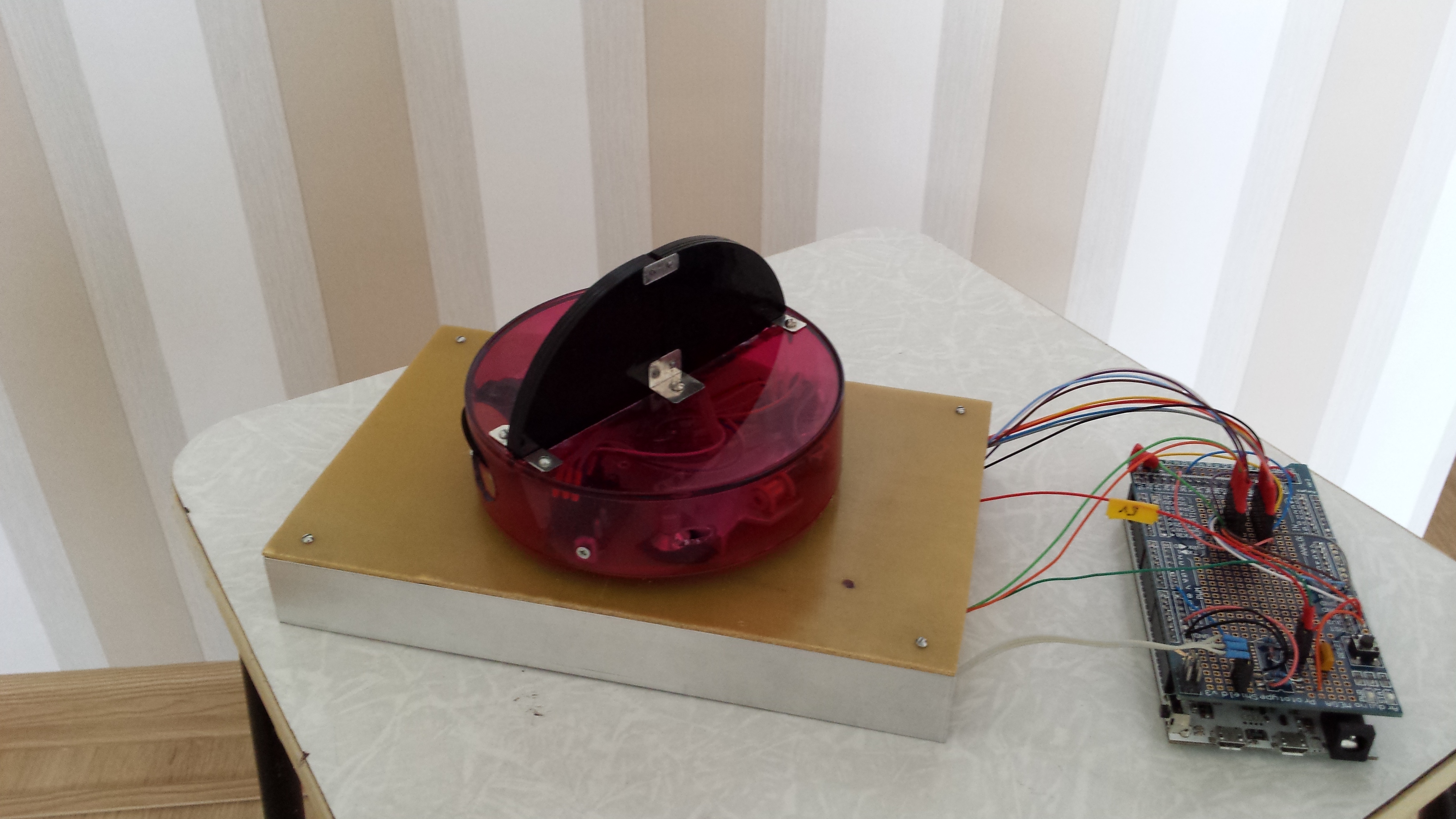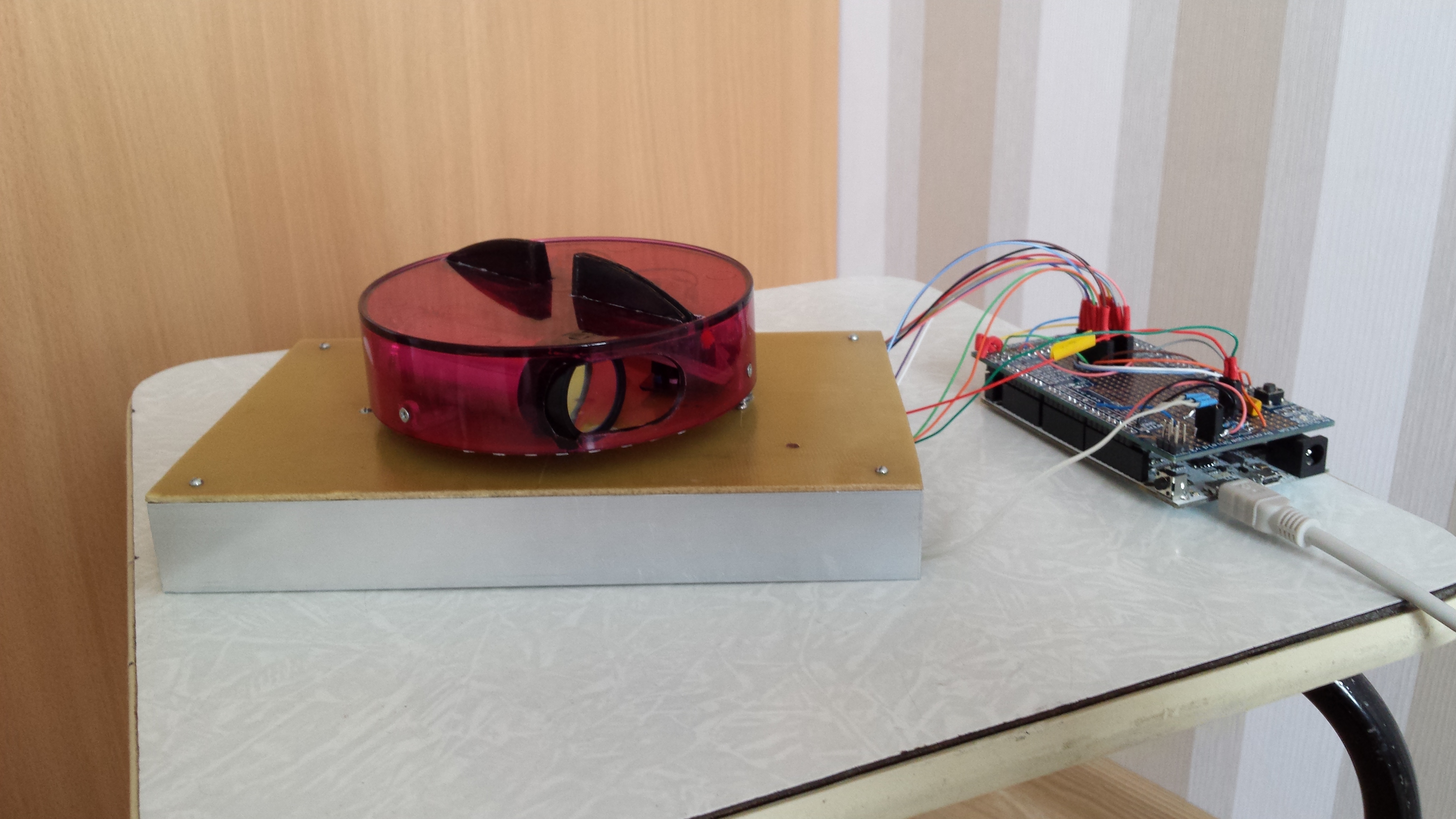 фотоприемники установлены в световоды цель которых пропускать сигнал от маяка только когда световод направлен точно на маяк.Световоды с приемниками установлены на вращающуюся от электромотора башню угловое положение которой определяется с помощью энкодера.С вращающейся башней мне было просто потому что она по сути уже у меня была.Я интегрировал систему навигации с построенным мной лидаром о котором подробнее можно прочитать в теме "Сканирующий лазерный дальномер"от citizen .