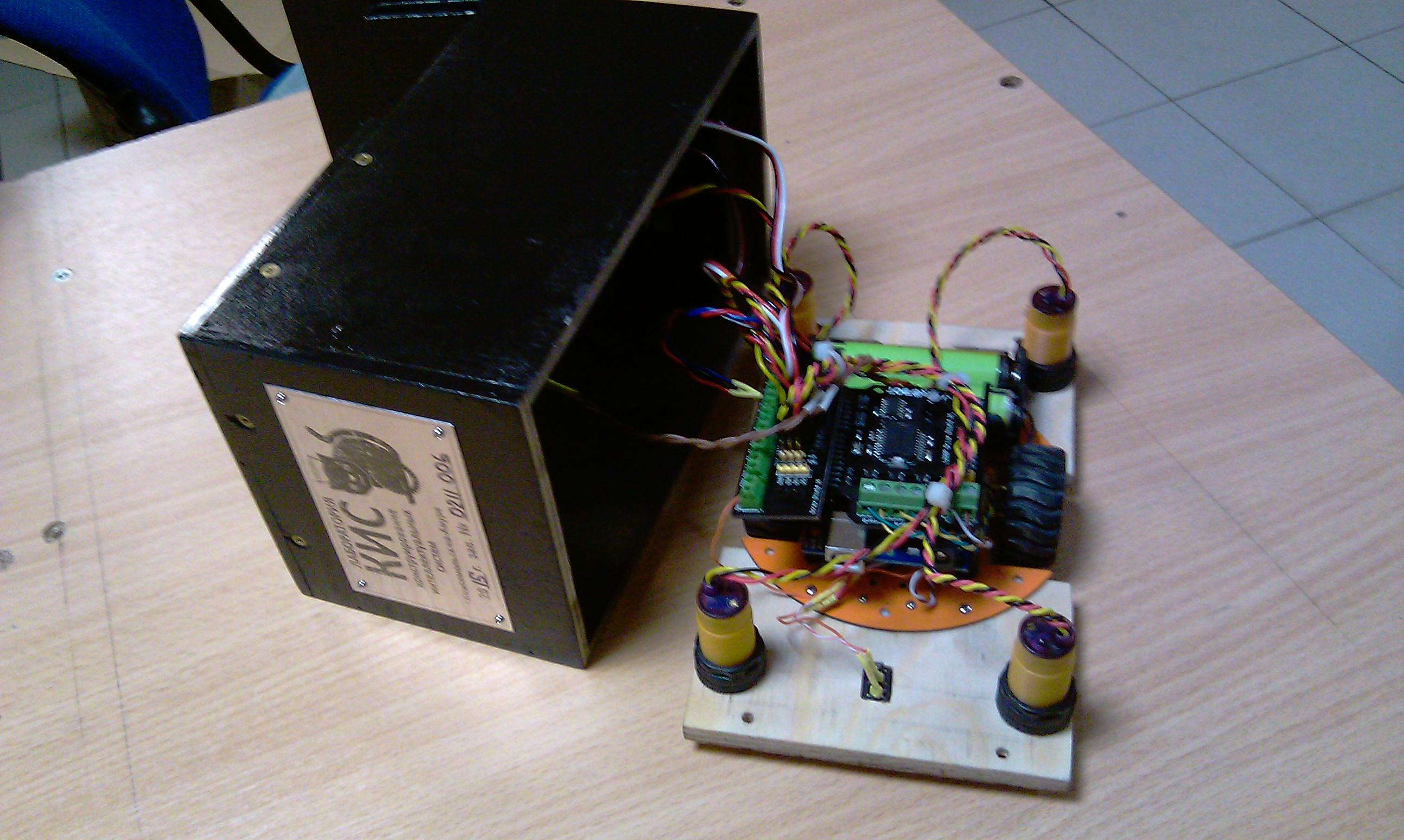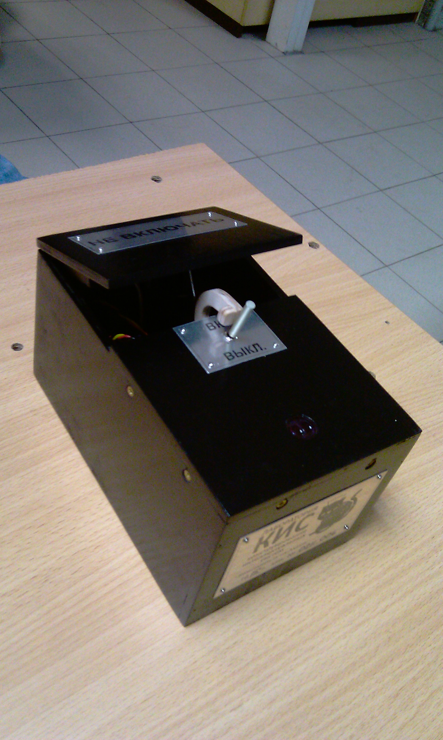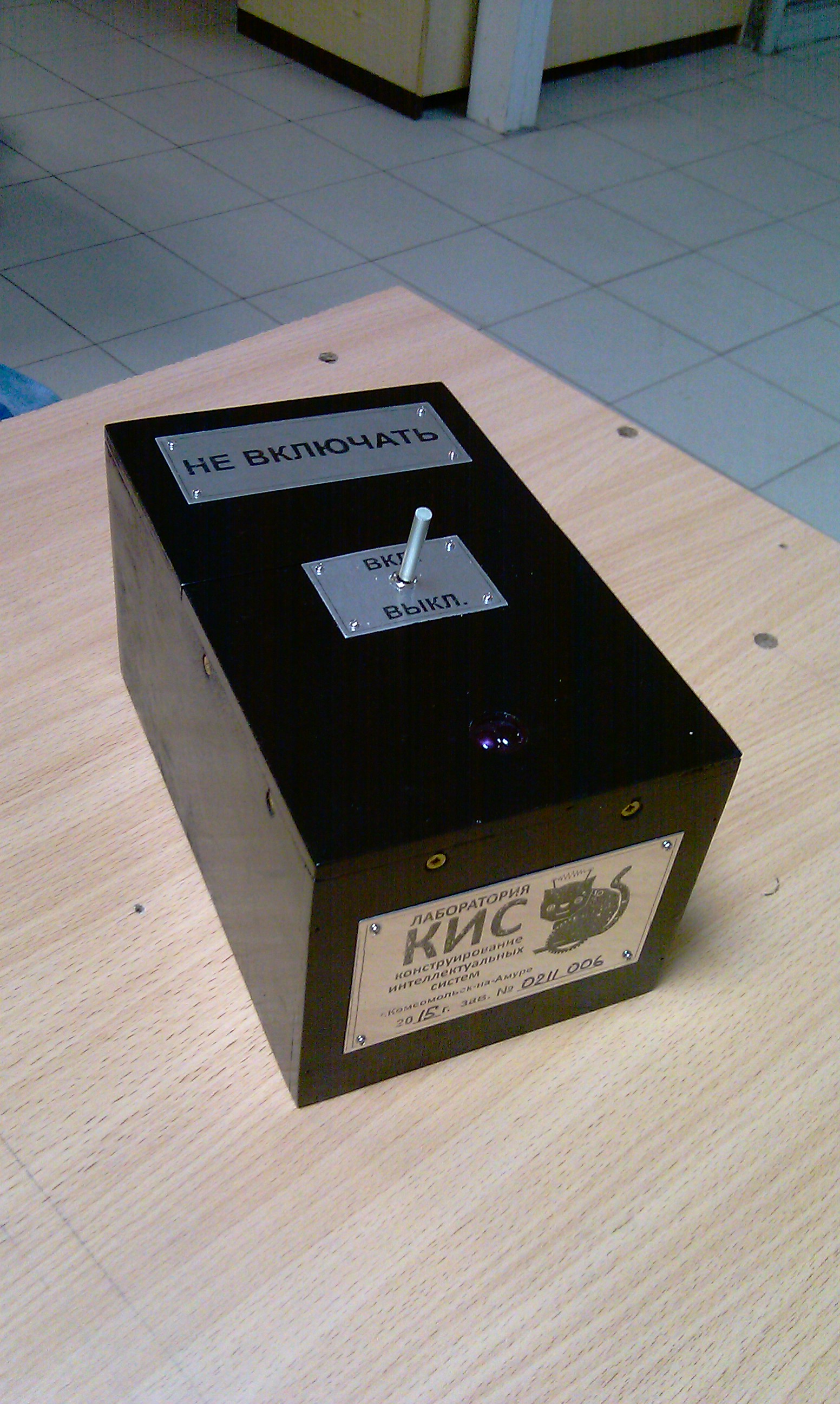 .Называется это устройство "Самая бесполезная коробочка". Идею подсмотрели в интернете и решили реализовать. Электроника - Arduino, драйвер двигателя, понижающий модуль, датчик реагирующий на приближение руки к тумблеру, датчики перепада высоты чтобы коробочка не падала со стола.