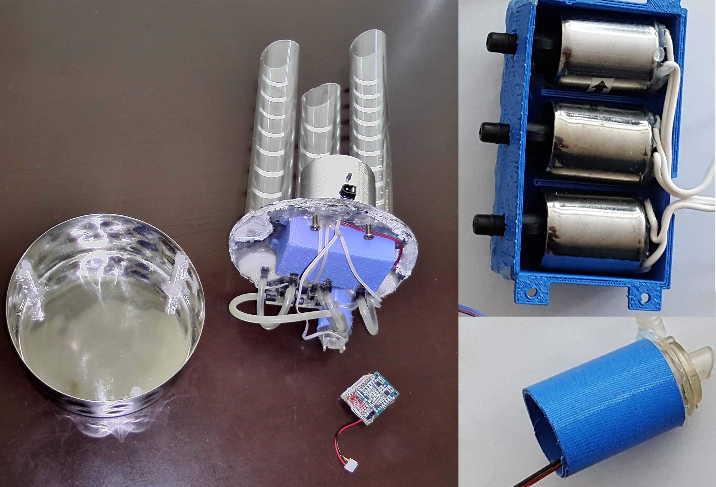 Возможно, вместо воды, лучше использовать какое-нибудь прозрачное масло. Типа, как в новогодних шарах со снегопадом. Но я в продаже такого не видел и не знаю, как будут на него реагировать пластмассовые детали клапанов и насоса.