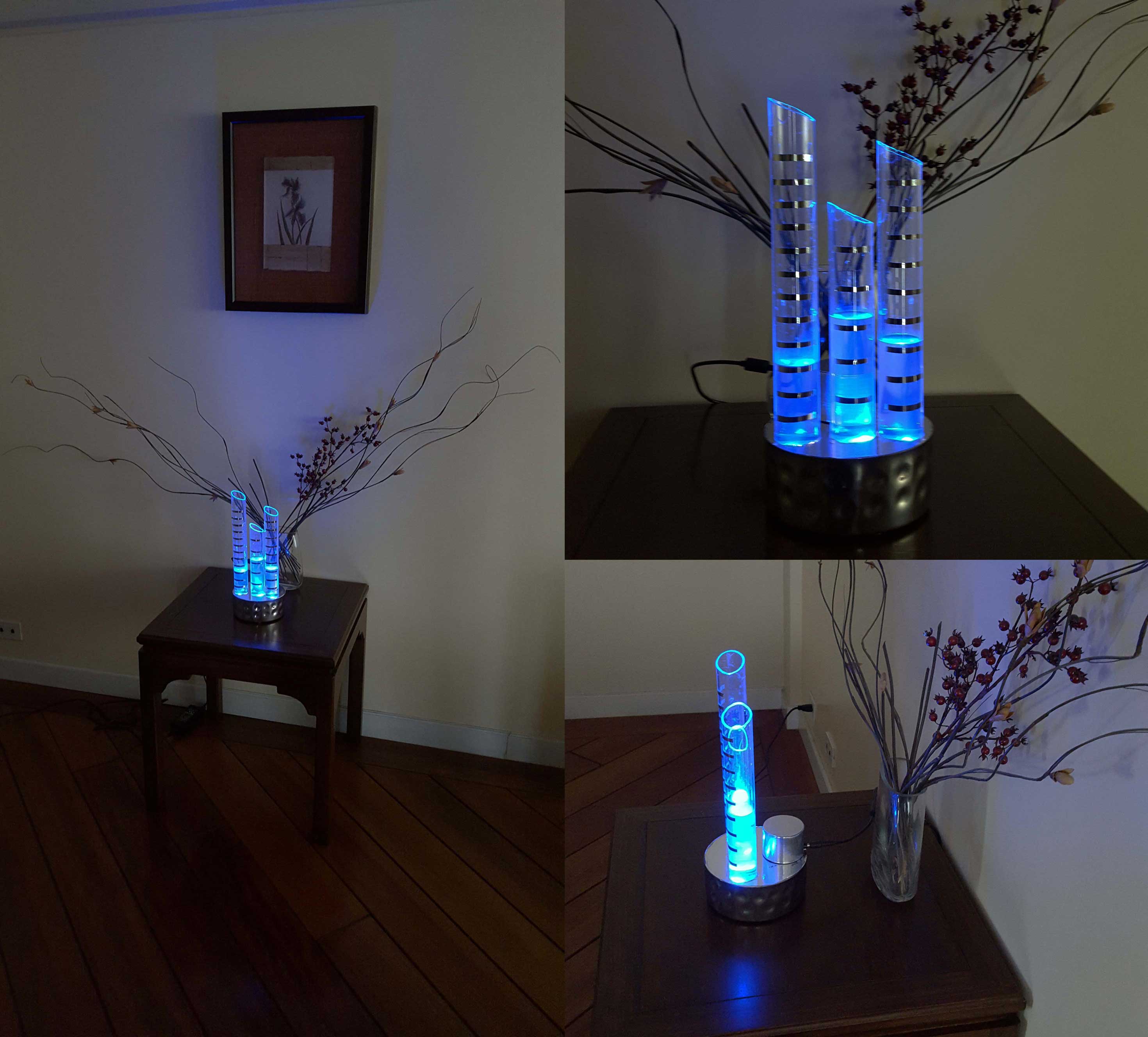 Устройство простецкое. 3 акриловые колбы, диаметром 40мм, для часов, десятков минут и минут. 3 соленоидных клапана и насос на 12В. 3 ярких светодиода для подсветки (мигание, фейдер, бегущий огонь) Платка с транзисторными ключами, микродуня и часы RTC.