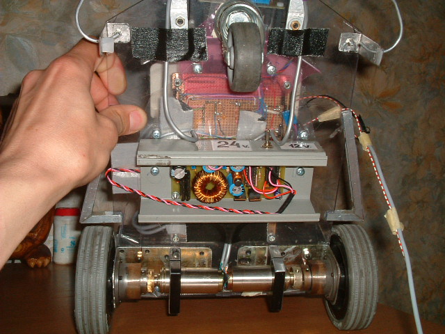 7. Конвертер 12-24V - под брюхом. Доработанная и улучшенная мной схема с просторов интернета. Моторчики можно питать от 12В - "робот-лентяй" или 24В - "робот-чокнутый";