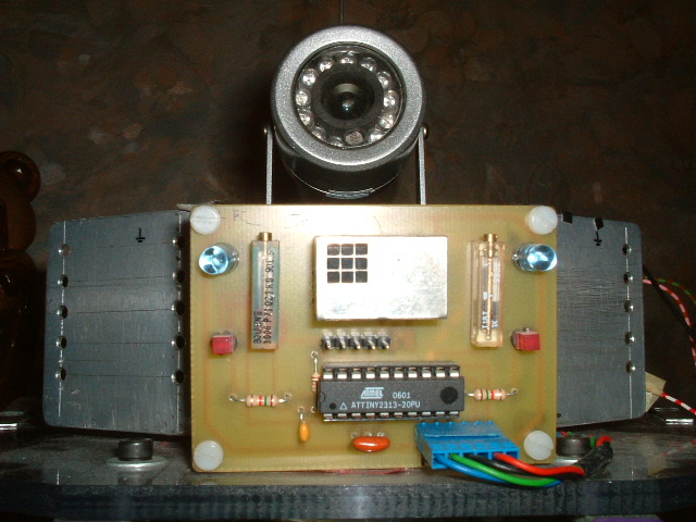 3. DPRG-clone ИК-бампер - 1шт, импульсный, впереди. оригинальный DPRG сделан на PIC + ассемблер. я сделал римейк, использовав AtTiny2313 и переписал программу в BascomAVR. достаточная стабильность, можно регулировать макс. дальность срабатывания. легко подгоняется по частоте под любой ИК-приемник от теликов;