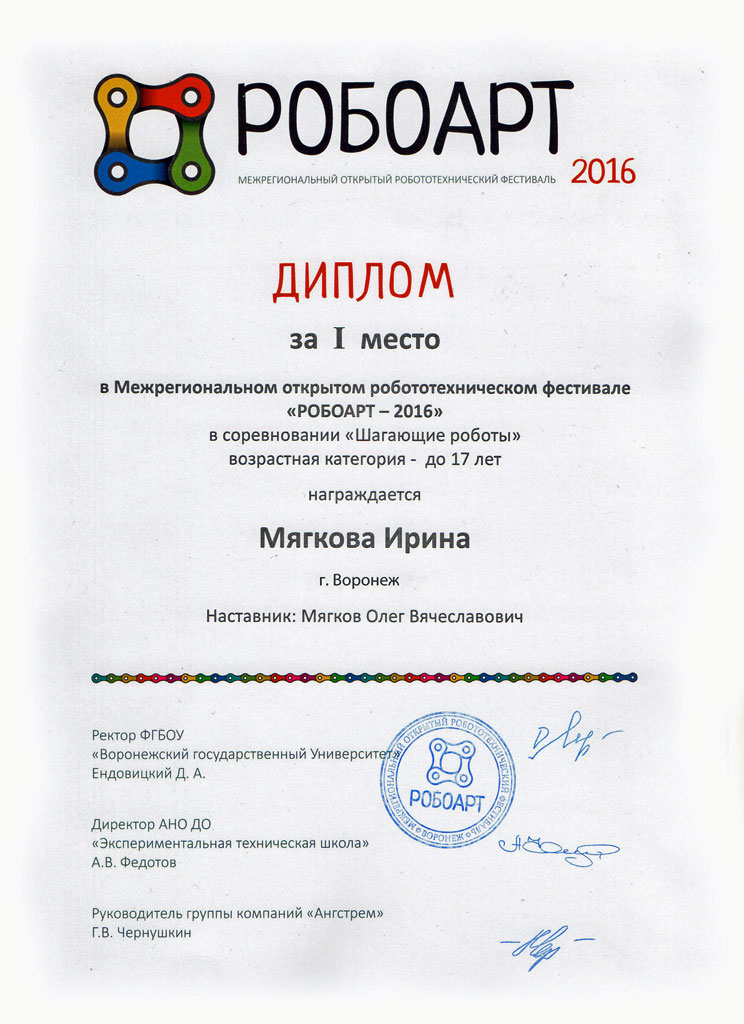 Прошел фестиваль "Робоарт 2016" в Воронеже. Неожиданно наша "Блошка" заняла I место в категории "Шагающие роботы" траектория.