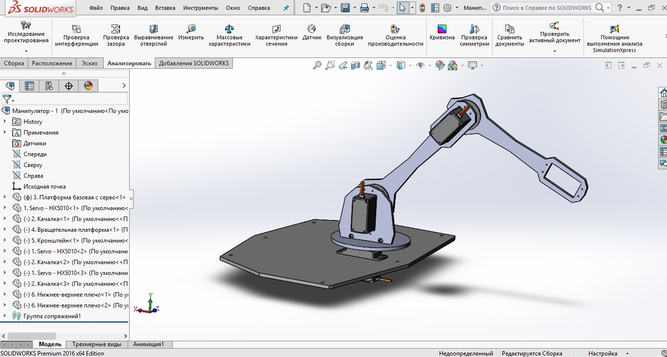 Проектирование конструкции манипулятора выполнил в программном пакете SolidWorks. 3D моделирование позволило учесть сразу все необходимые размеры, сборка позволит избежать проблемы с сопряжением элементов механизма.