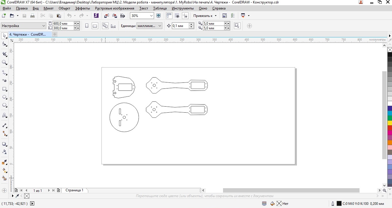 Для этого сделан фаил чертежа в SolidWorks, затем данный фаил перемещен в AutoCAD, для то того чтобы более лучшим способом скомпоновать элементы робота-манипулятора. После компоновки, фаил перенесен в CorelDRAW, в нем еще раз проверены размеры и фаил пересохранен в pdf.