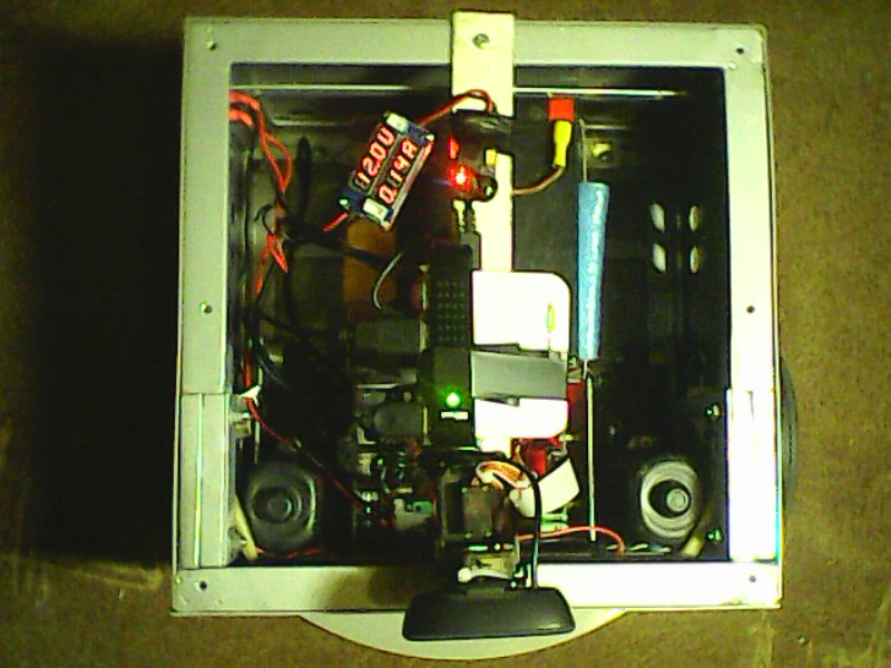От себя добавил еще один DC-DC 12-5V авиамодельный, роутер Mr 3020 с прошивкой Опенроботикса 0.77, микрохаб на 4 порта, камеру логитек С270 на кронштейне с сервами и микрофлешку под extroot.
