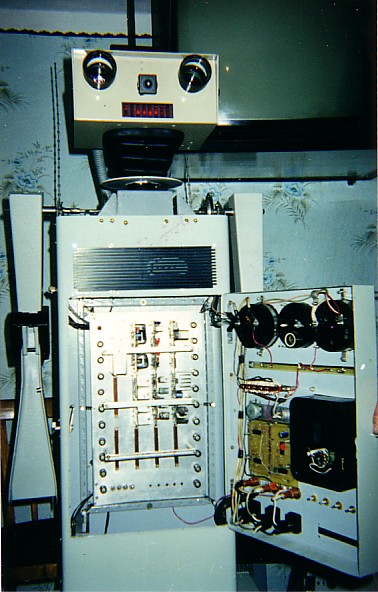 Сигналы «VIDEO» и « AUDIO» с камеры поступают на маломощный телепередатчик, взятый от игровой приставки «Денди». В передатчике установлен дополнительный каскад усиления ВЧ сигнала. Благодаря этому радиус действия между роботом и телевизором пульта управления достигает 50 метров. Передатчик телевизионного сигнала робота настроен выше по частоте 12 телевизионного канала (240 МГц), чтобы не мешать просмотру ТВ ближайшим «соседям». При желании, телепередатчик можно настроить на любую свободную частоту с 1  по 12 телевизионный канал, а также за диапазоном.
