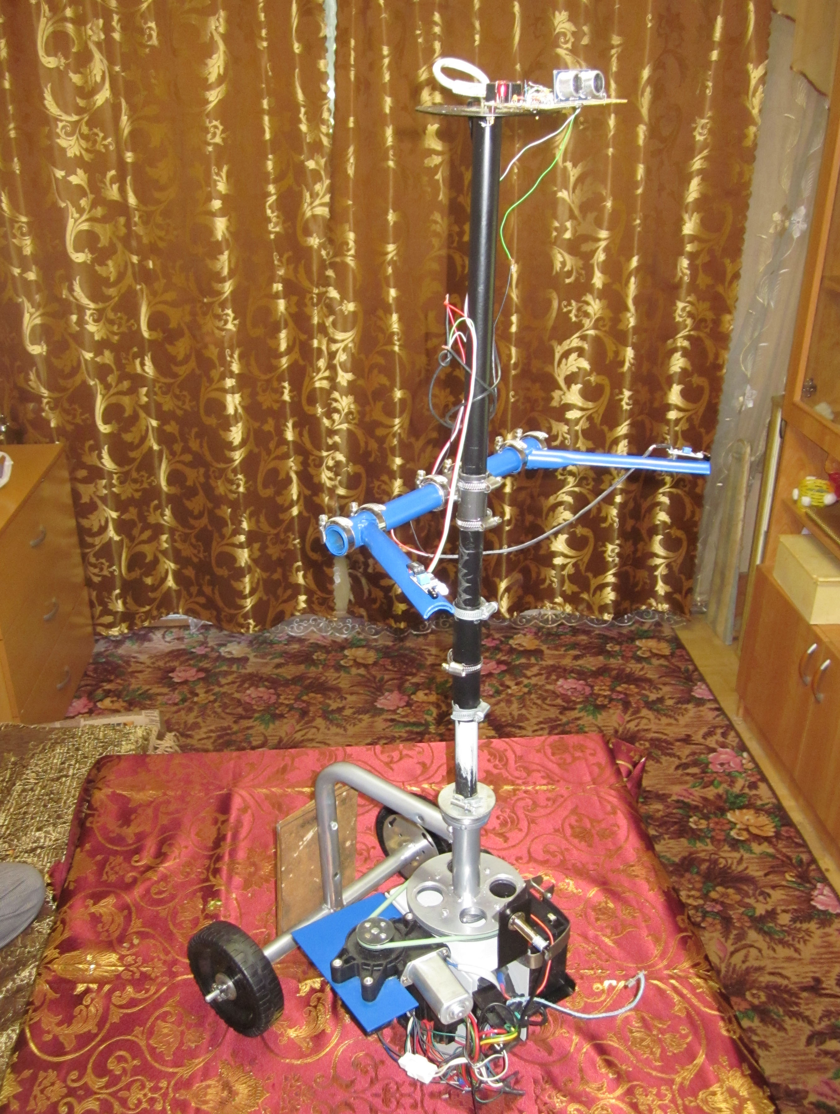 http://roboforum.ru/forum10/topic17762.html Но тогда ещё не было понимания, как будет выглядеть робот, сделанный по такой схеме, и какие плюсы будут в такой конструкции. Суть концепции в следующем: все механизмы и агрегаты робота размещены на одной вертикальной оси. В нижней части оси расположено ведущее колесо с тяговым двигателем и редуктором. С боку находится батарея и плата драйверов и некоторые датчики. Над ними рулевой механизм с двигателем и редуктором. Выше находится втулка с подшипниками, в которой, собственно, и вращается ось. К втулке прикреплено основание с двумя опорными, свободно вращающимися колёсами. Точки касания ведущего и опорных колёс, образуют равносторонний треугольник. Вся конструкция, не много напоминает детский, трёхколёсный велосипед. В верхней части оси расположена «голова» робота с микроконтроллерами, датчиками, и видеокамерой Ниже «головы», расположены «руки», на концах которых так же расположены датчики. Кроме того, на руки можно что-то установить. Например, поднос с напитками… Для устойчивости, на основание устанавливается противовес. Можно, вместо противовеса установить аккумуляторную батарею, но тогда придётся делать токосъёмные кольца, наподобие тех, что стоят в автомобильных генераторах. Сейчас, пока, для управления используется Атмега8. Для ориентации, сонар HC-SR04, ИК датчики.