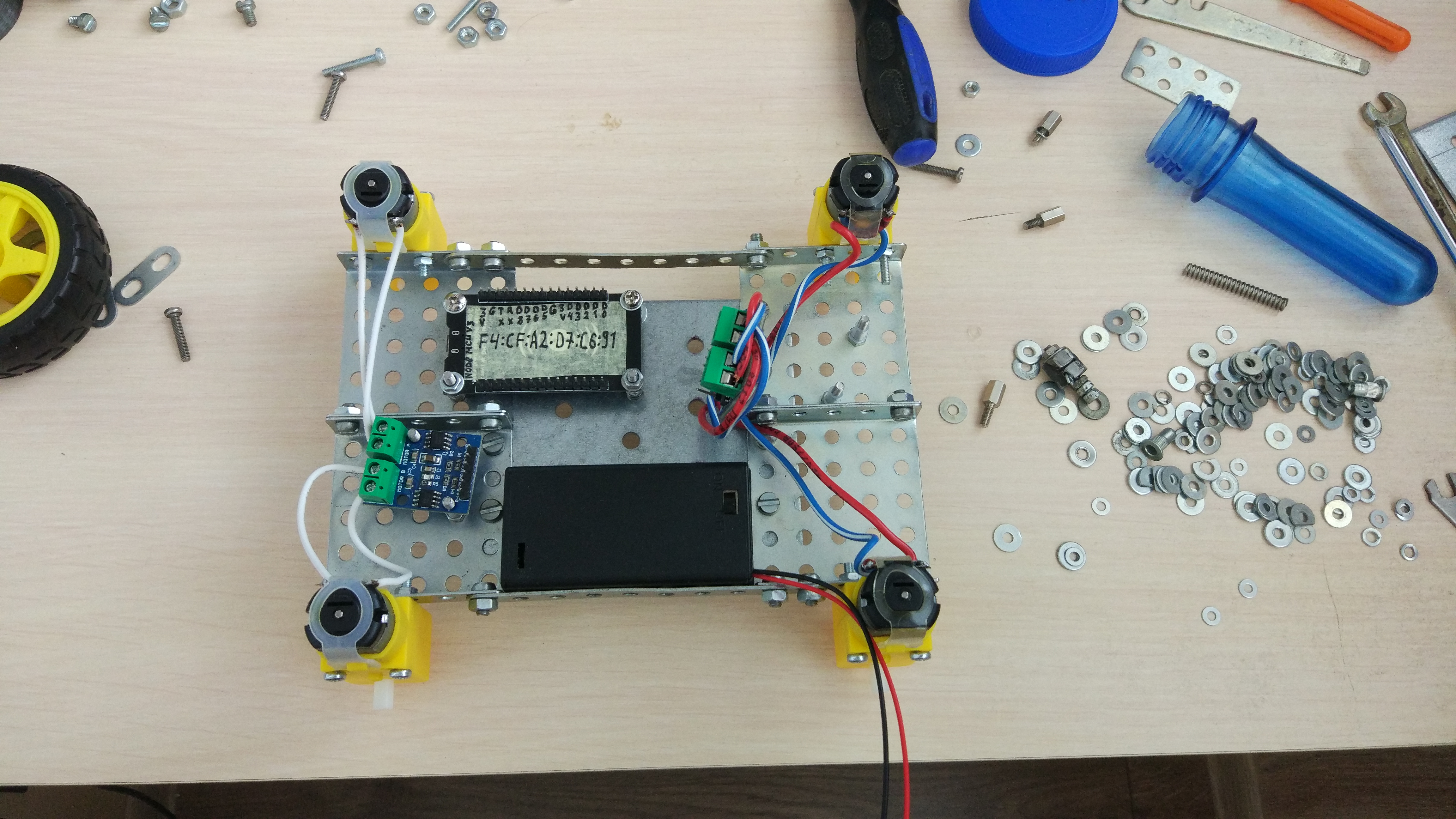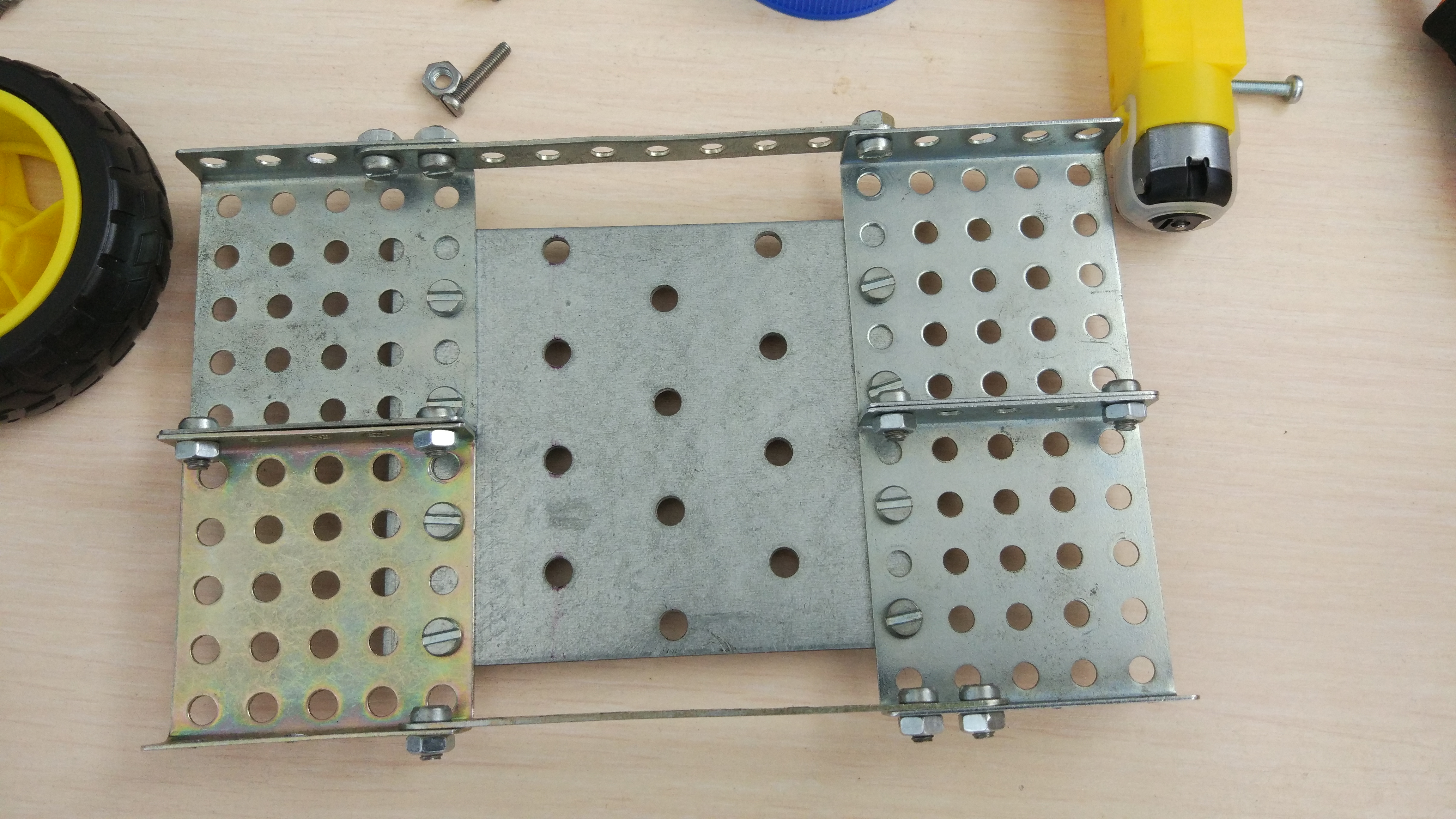 в качестве шасси металлический конструктор моего детства, единственно дырочки под крепления редукторов надо надфилем чуток по ,5мм проточить, строительные перфорированные пластины подходят под конструктор идеально.