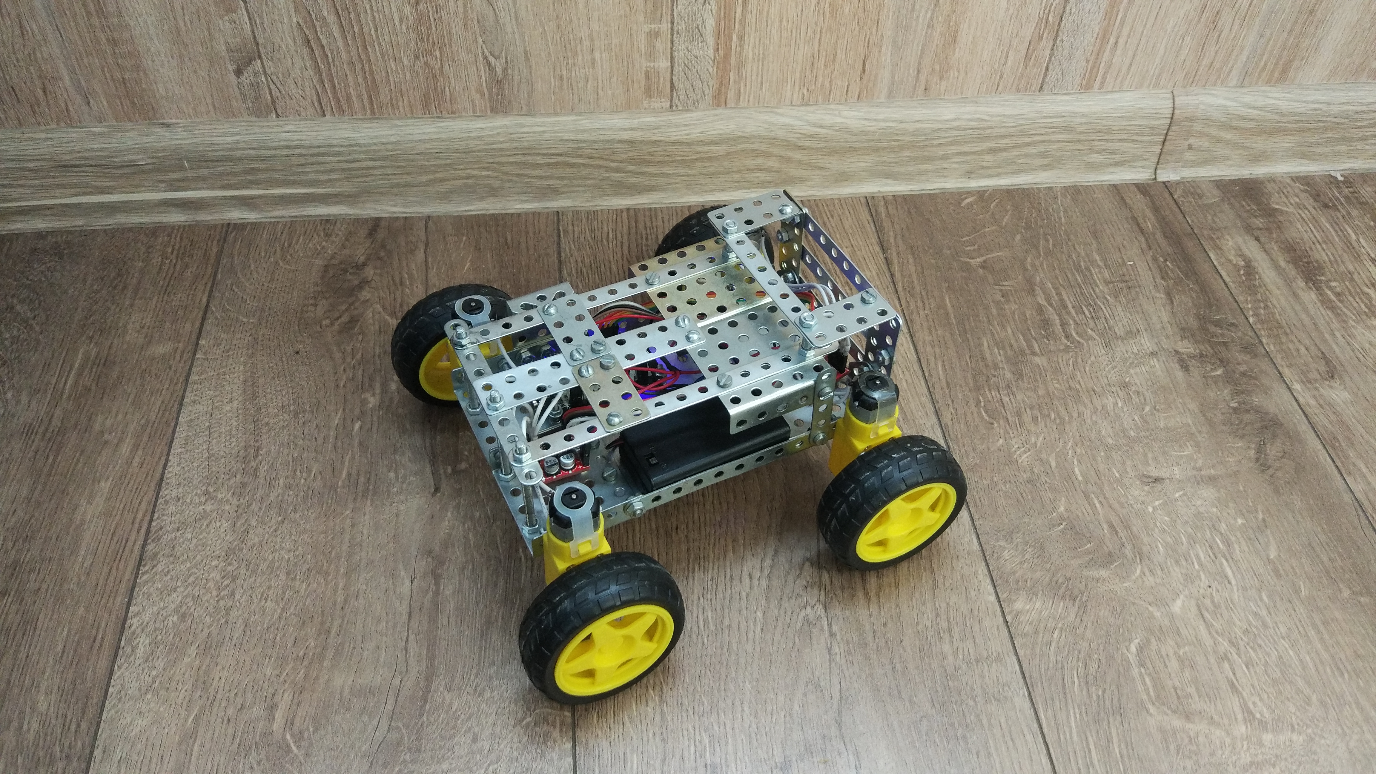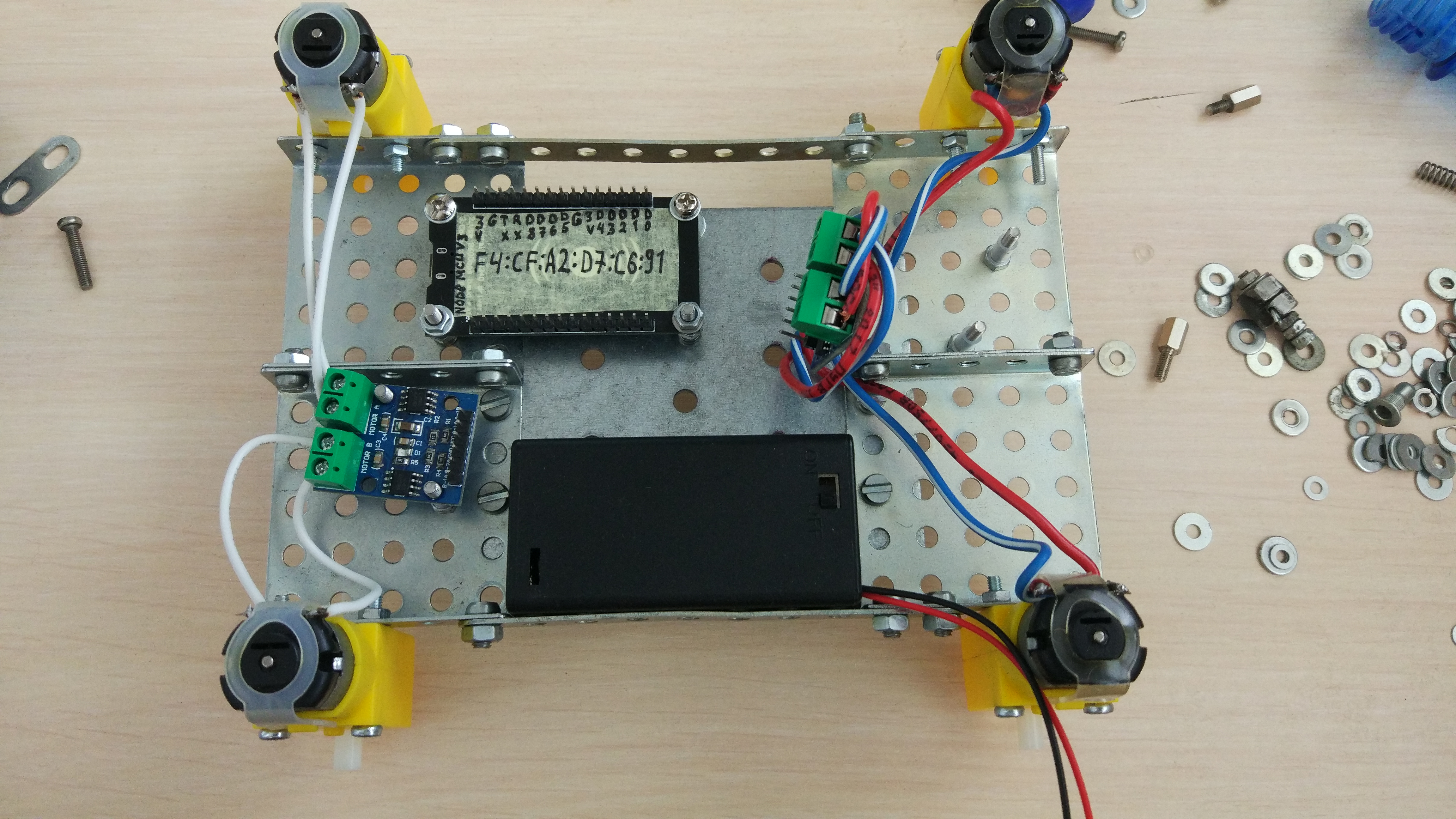 в качестве шасси металлический конструктор моего детства, единственно дырочки под крепления редукторов надо надфилем чуток по ,5мм проточить, строительные перфорированные пластины подходят под конструктор идеально.