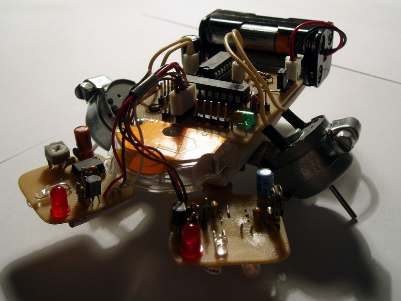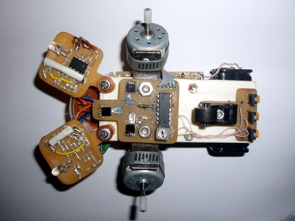 Всем добрый день, вечер, ночь утро.. как то бродил я по каталогу мастеркита и наткнулся на робота, жука.. наверное многие видели этот набор.. захотелось повторить что то подобное, но ознакомившись другими работами роботов, сразу появилась критичность к предложенному варианту печатной платы.. ознакомля с даташитом тини2313 набрасал печатку управляюшей платы, затем печатку двук датчиков ИК и датчика поверхности..Кстати, долго мучился, думал как крепить двигатели к трапецеидальной балке, которая отлично обеспечиаве жесткость конструкции (все таки сталь миллиметра два толщиной - гнул на тисках, со второго раза получилось достичь симметрии, чтобы робот ползал достаточно ровно) Так вот, в магазине автозапчастей когда увидел эти хамутики, дошло - то что нужно! ИК датчики столкновения, крепятся на втулках, легко настраивать под разным углом.. Вот некоторые фотки.. на данный момент реализован алгоритм следования по линии (смотрите видеоролик) и своего рода коробка на 10 скоростей с помощью ШИМ. Теперь работаю над звуком и радиоуправлением))