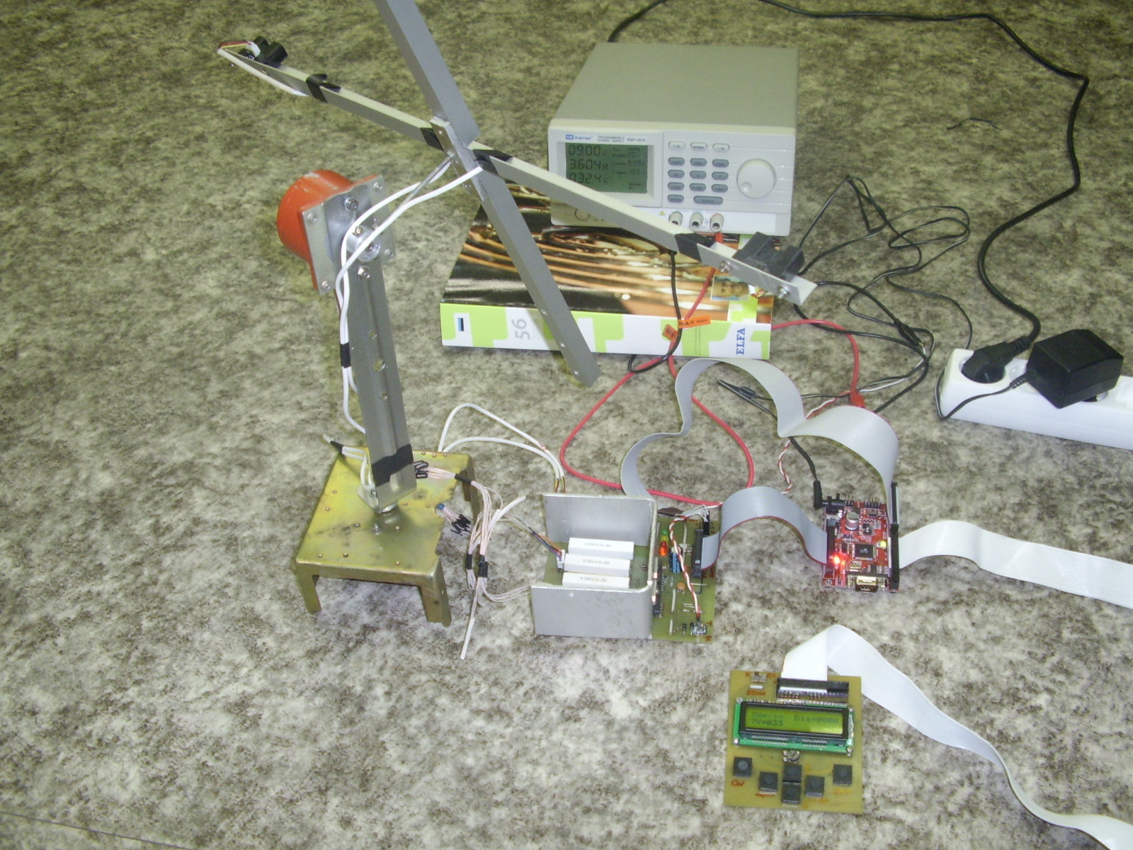 состоит из 4х частей: поворотной рамы, на которой закреплена крестовина с 4-мя датчиками и два шаговых двигателя, вращающих крестовину по горизонтали и вертикали; платы управления и индикации, платы с драйверами, модуля с контроллером.ИК дальномеры GP2Y0A02YK (2 горизонтальных, 2 вертикальных) засекают объект и "мельница" начинает следить за ним, изменяя направление и скорость вращения.