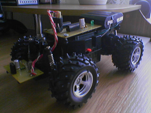2) пищала не микруха, двигатели, причем особено задний. И тяга была жутко слабая. Померил, в чем дело,а оказывается задний двигатель почти 1,6А кушает при старте. Погрешил на драйвер (всё таки на 600 мА расчитан) сделал так, рулевой двигатель оставил на L293DNE, для заднего на MOSFET сделал H мост. прилепил отсек для батареек, теперь вместо 3х1.5В - 4х1.2В аккумуляторы по 1.5 А*ч. Питание МК и логических цепей завел через LM2931AZ, таким образом если захочется сфорсировать движки - можно просто добавить пару аккумуляторов :) Помех не наблюдаю (1000 мкф по питанию +изначально китайцами 0,1мкф параллельно с движками). Шасси от китайской машинки (289 р в ашане), аккумуляторы КОСМОС 4 штуки (86р. за пару в ашане).