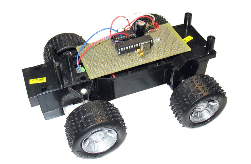 1) у моего датчиков нет пока вообще. Пока объезжает препятствия только за счет случайности движения. 2) пищала не микруха, двигатели, причем особено задний. И тяга была жутко слабая. Померил, в чем дело,а оказывается задний двигатель почти 1,6А кушает при старте. Погрешил на драйвер (всё таки на 600 мА расчитан) сделал так, рулевой двигатель оставил на L293DNE, для заднего на MOSFET сделал H мост. прилепил отсек для батареек, теперь вместо 3х1.5В - 4х1.2В аккумуляторы по 1.5 А*ч. Питание МК и логических цепей завел через LM2931AZ, таким образом если захочется сфорсировать движки - можно просто добавить пару аккумуляторов Помех не наблюдаю (1000 мкф по питанию +изначально китайцами 0,1мкф параллельно с движками). Шасси от китайской машинки (289 р в ашане), аккумуляторы КОСМОС 4 штуки (86р. за пару в ашане). 3) на PC0 повесил светодиод,в прочессе работы программы он помигивает, используется для диагостики и как внешний эффект. Пока работу не закончил (датчиков надо добавить, да и робота такого делаю в учебных целях и как стартовая площадка для более сложной задумки), но обещаю по окончании выставить подробный отчет с фотками и схемами-алгоритмами у себя на портале licrym.org. Ну и фотку сюда)
