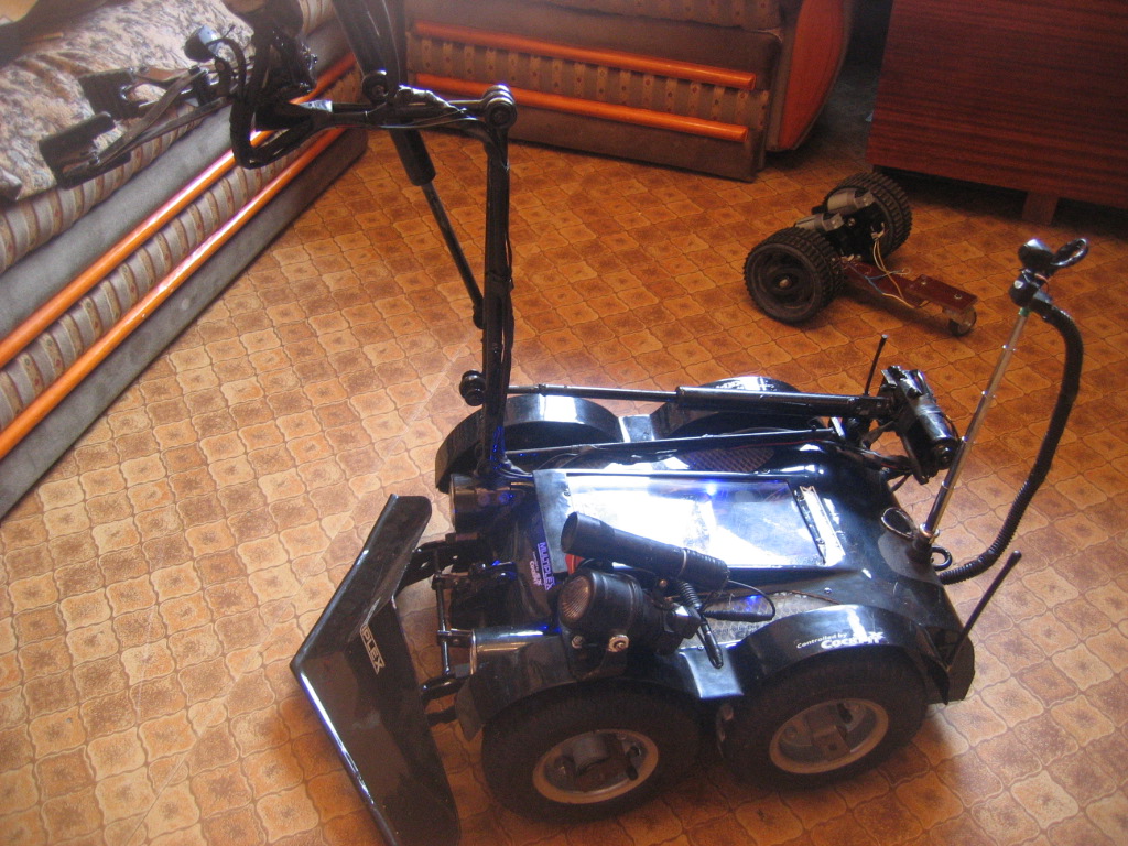 А нафик ковш? Чтоб им упираться, когда тяжелое клешней поднимаешь? Сколько манипулятор поднять может, кстати (хлипкий какой-то на вид)?