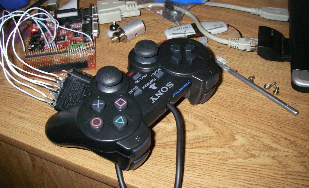 Седня съездил на Юнону, купил себе подарков - всякого железного хлама. Экспонат номер один - джойстик для плейстейшн 2 за 50 рублей =) Давно уже была идея, что надо сделать внешний контроллер какой-нить удобный для экспериментов всяких.. а тут оно под руку подвернулось так удачно.