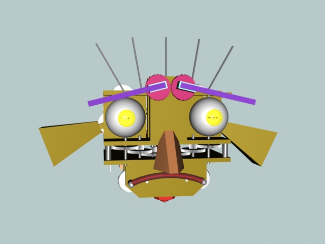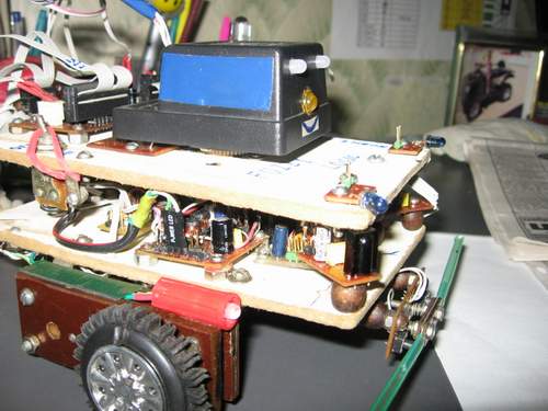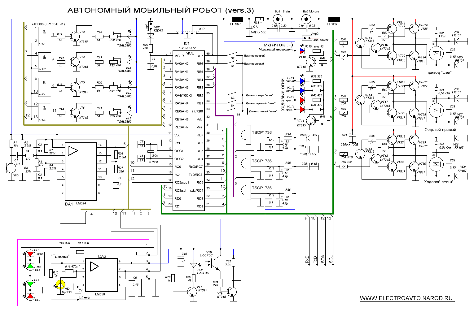 - Большой самомигающий многоцветный светодиод. Мозги PIC16F877A. ИК датчики на ТСОПах и ИК диодах (пока не доделал). Датчик "пола" - ИК светодиод и ИК транзистор повешенный на вход АЦП. Н-мосты транзисторные.Работает это все таким образом - После включения центруется "голова", далее робот начинает свободное движение по комнате. Причем иногда случайно меняя направление. Если в комнате достаточно темно, то включаются "ходовые огни". Если в "глаза" ему светить фонариком, то робот начинает уходить от яркого света (как бы психовать), если это повторяется несколько раз, то светодиоды-глаза зажигаются красным светом, робот становиться как бы злой и находит самый темный угол и прячеться туда. Через некоторое время красные глаза выключаются и робот возвращается к свободному движению. Если робот теряет контакт с полом (взяли его в руки), то он дергает туда-сюда моторами и включается "проблесковый маячок", как только контакт с полом восстановлен робот переходит опять к свободному движению. Если робот долго (около 20 сек) не натыкается ни на одну помеху и его не трогают то светодиоды глаза зажигаются зеленым светом (как бы добрый) и робот начинает искать самое яркое место. Поиск светлых (темных) мест реализуется так: измеряется уровень света перед собой, далее "Голова" поворачивается направо, измеряется еще раз и сравнивается, если справа ярче то робот поворачивается примерно на 10 градусов направо и делается повторное измерение, если же справа сигнал слабее, то поворачивается голова налево измеряется сигнал и если он сильнее то ходовая поворачивается на 10 градусов налево. И т.д. Пока не будет найден максимум (ну или минимум) перед собой. Когда он найден голова устанавливается в центр и начинается движение вперед около 3 секунд, далее стоп и повторно все измеряется, этот цикл повторяется 7 раз и затем считается что поиск светлых мест завершен. При столкновении с препятствием происходит стандартный маневр - чуть назад, поворот, вперед. После маневра сразу же начинается измерение света (если это требует текущее состояние робота).