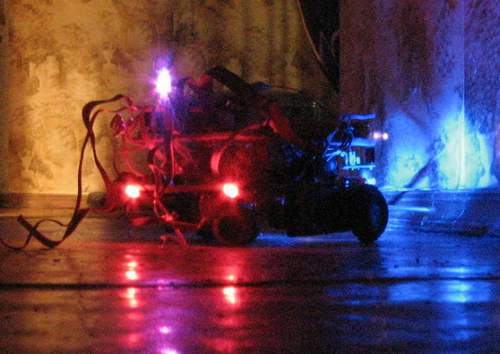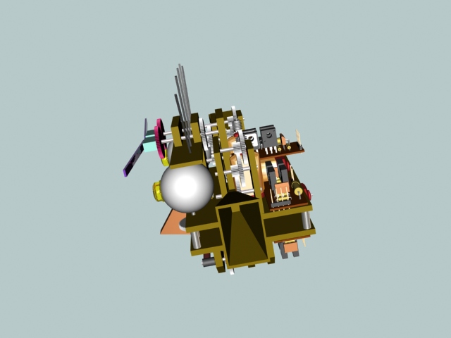 Схема трехколесная, с одним задним опорным и двумя ведущими колесами, редукторы самодельные. "Голова" поворачивается на самодельном сервоприводе, в качестве датчиков положения головы используются обычные штырьки, которых касается пружинка при повороте. Т.е. 3 положения - ЦЕНТР, ВЛЕВО 45 градусов и ВПРАВО 45 градусов. На "голове" установлен датчик видимого света, и 2 двухцветных светодиода. Также на роботе установлены "ходовые огни", впереди 2 синих и 2 красных сзади, а также "проблесковый маячок"